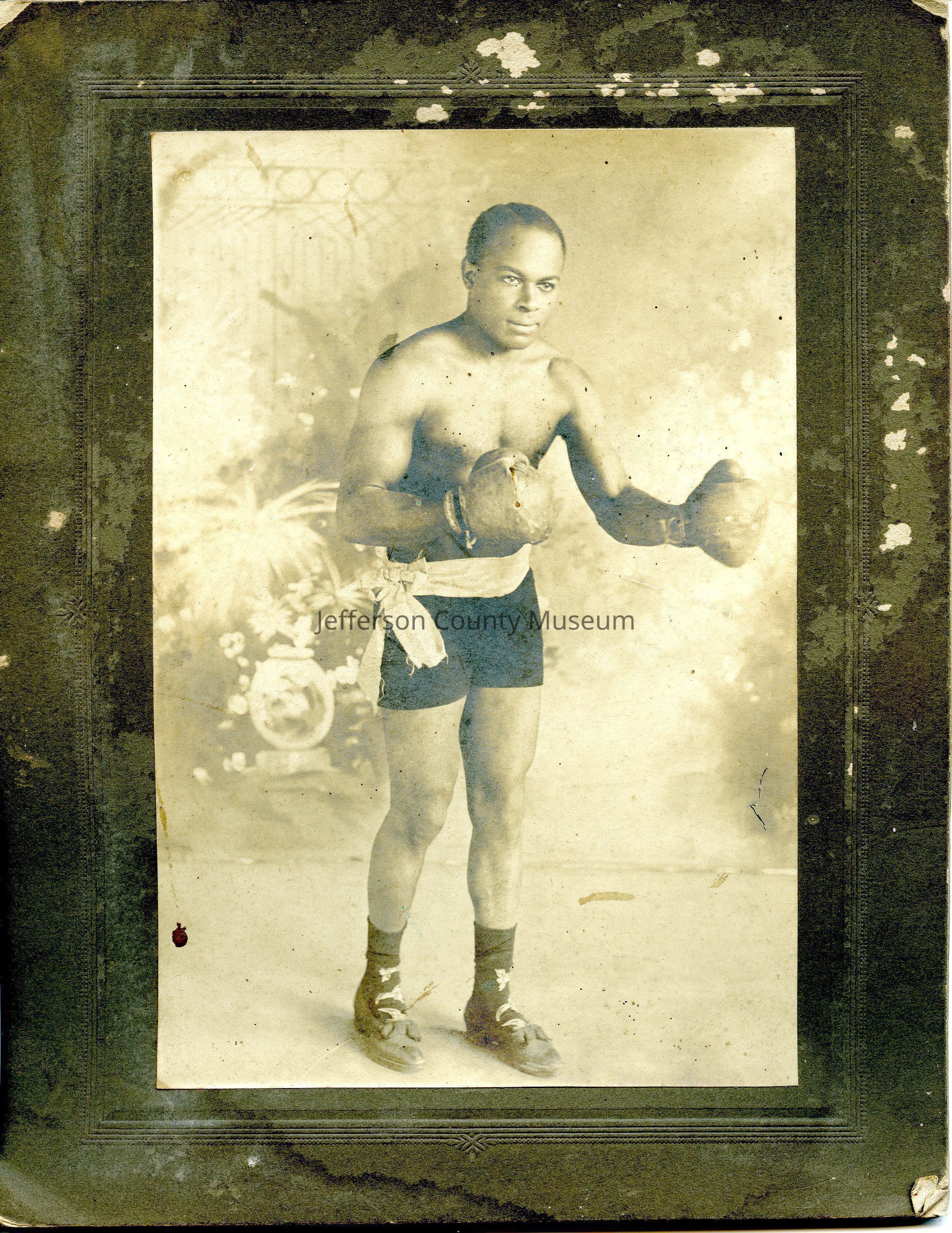 Unidentified African American man wearing boxing trunks and boxing gloves in front of posed backdrop.Acquisition