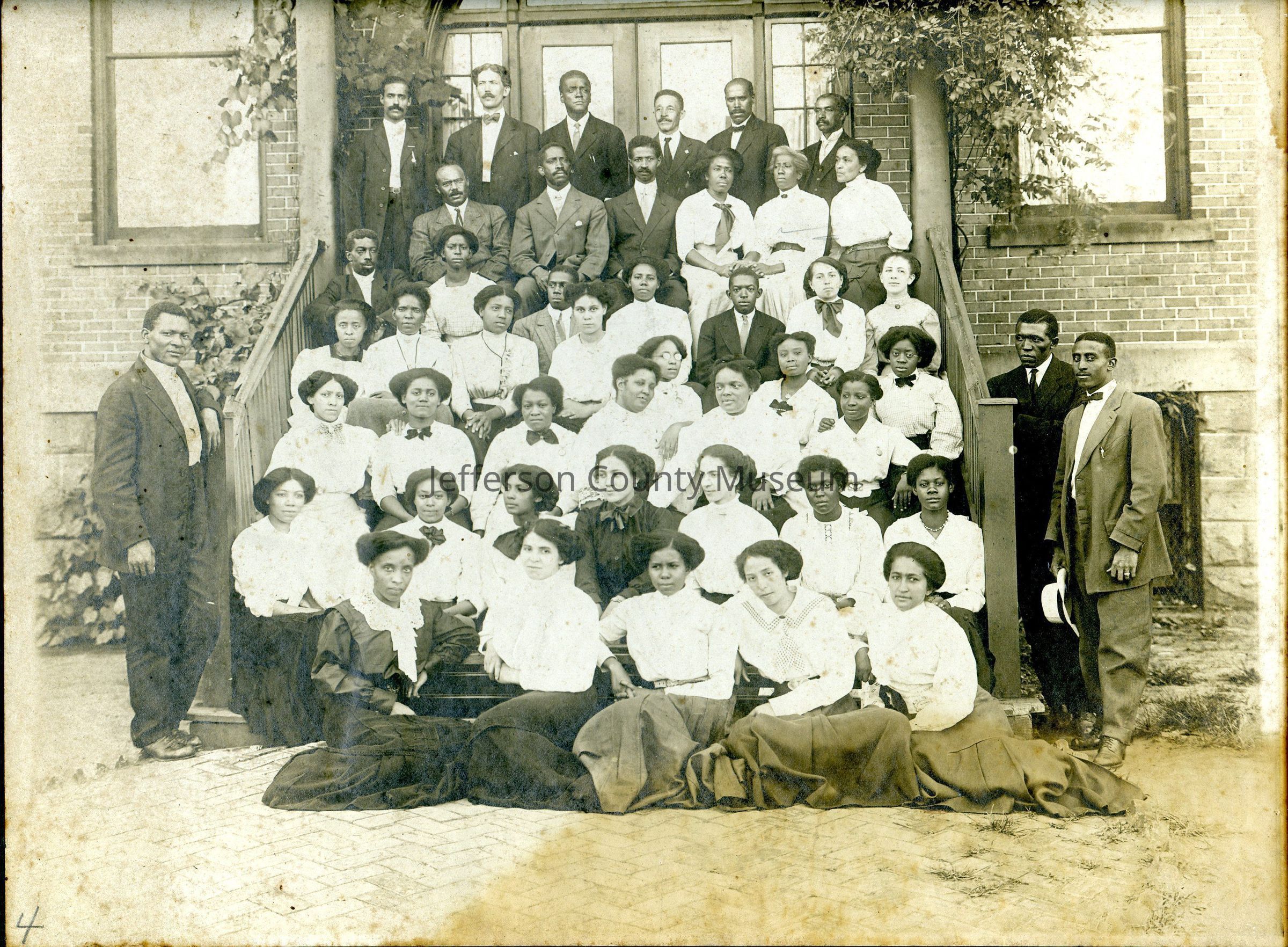 Students and faculty of Storer College. African American men and women on steps of unidentified brick building with herringbone pattern brick sidewalk in front of steps. Only Henry McDonald, president of the college from1899 to 1944, is identified (second from left in the last row). Written in pencil above photograph: "Page". "Page" may refer to Cerelle Page Craven or Page Craven, but she is unidentified.Acquisition
