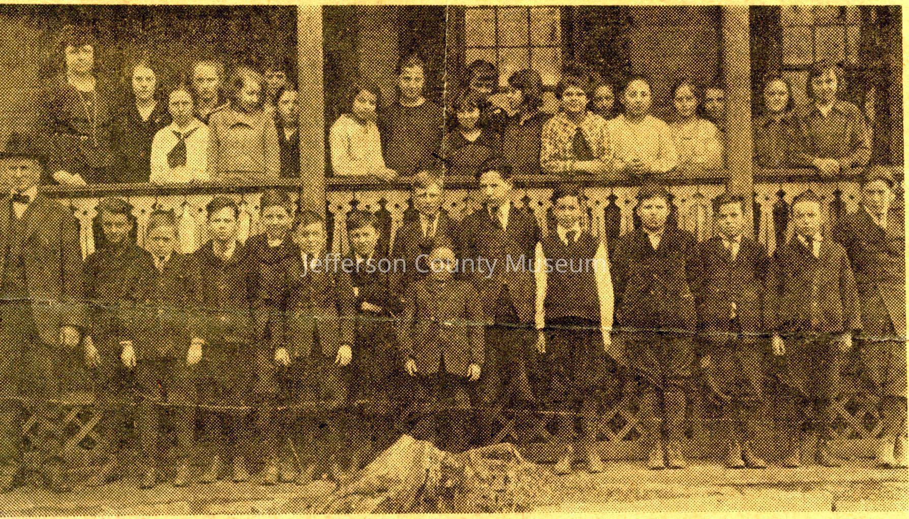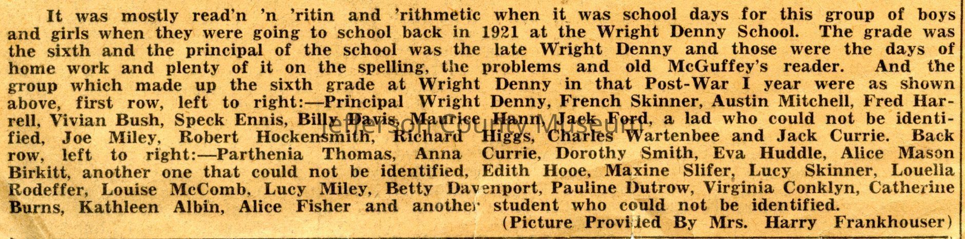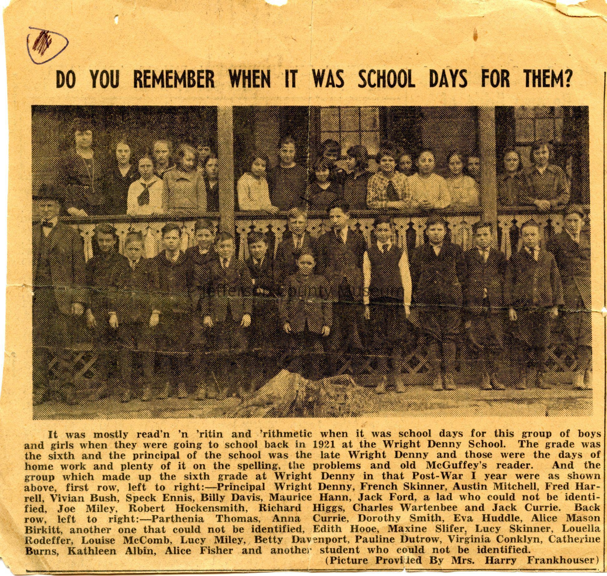 Article from the "Spirit of Jefferson", February 13, 1958, with picture of the Wright Denny School sixth grade class of 1921. Pictured is Wright Denny, principal of the school.Acquisition