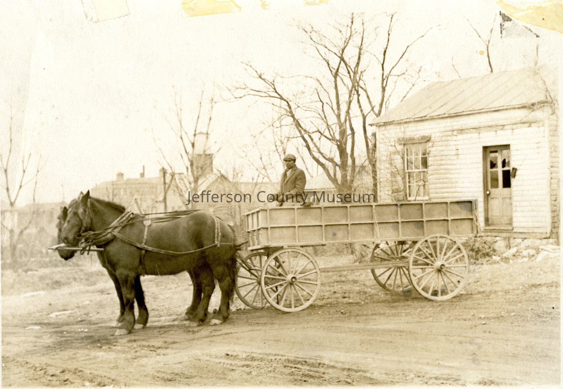 The building in the background is the Goetz Harness Factory - the building with the "tower" which is a water tower. The factory was located in the block of West 2nd Avenue, North George Street, 3rd Avenue and Buchanan Street. The wagon was on a rise near North Mildred Street between 2nd and 3rd Avenues. The photographer was looking southwest.Acquisition
