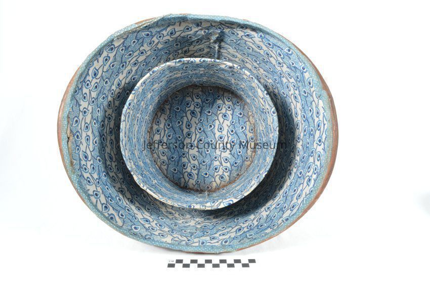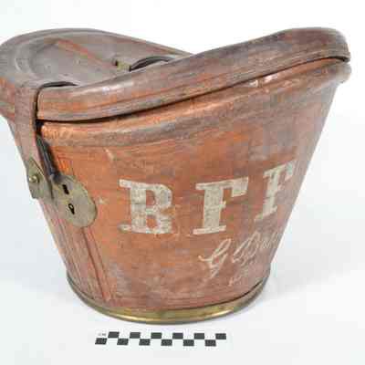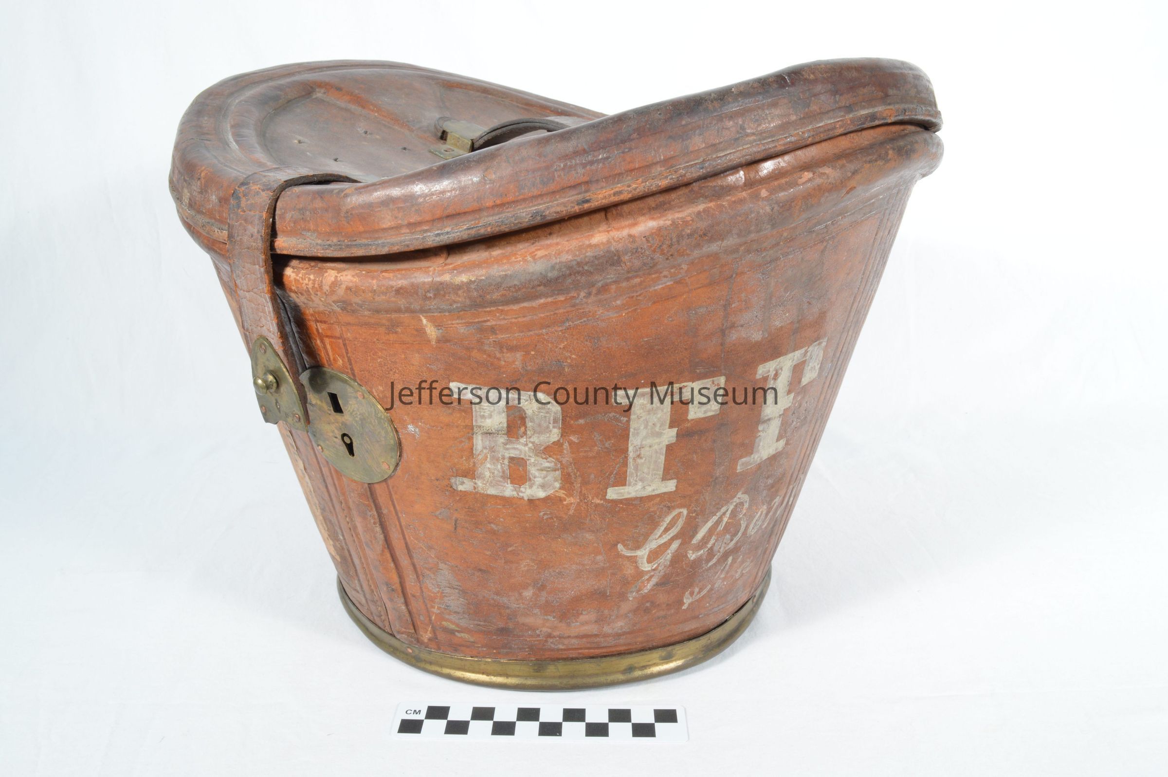 Leather and cloth hatbox for top hat catalog number 257. The box is elliptical to conform to the shape of the hat and has a curved lid with a handle and strap with brass fittings. One side of the strap is missing its brass keeper. Around the bottom of the box is brass reinforcement with four brass buttons on the bottom to prevent wear. There is also a round brass lock on one side for locking the keeper on the lid. Painted in fading white on one side is "B F F G Borro Ala". A paper label glued on the side has the picture of a hotel and "---M NATIONAL HOTEL, WASHINGTON ---" At the bottom is "--- TENNEY & CO. PROPRIETERS". The inside of the box and lid is covered with a blue and white material with a blue leaf design. Inside the box is a round form to stabilize the hat during transit. An old paper note taped to the top rim of the box contains the words: "BEAVER HAT & HAT BOX FROM PARIS, FRANCE 1840 COL. JOHN J. GRANTHAM".Acquisition