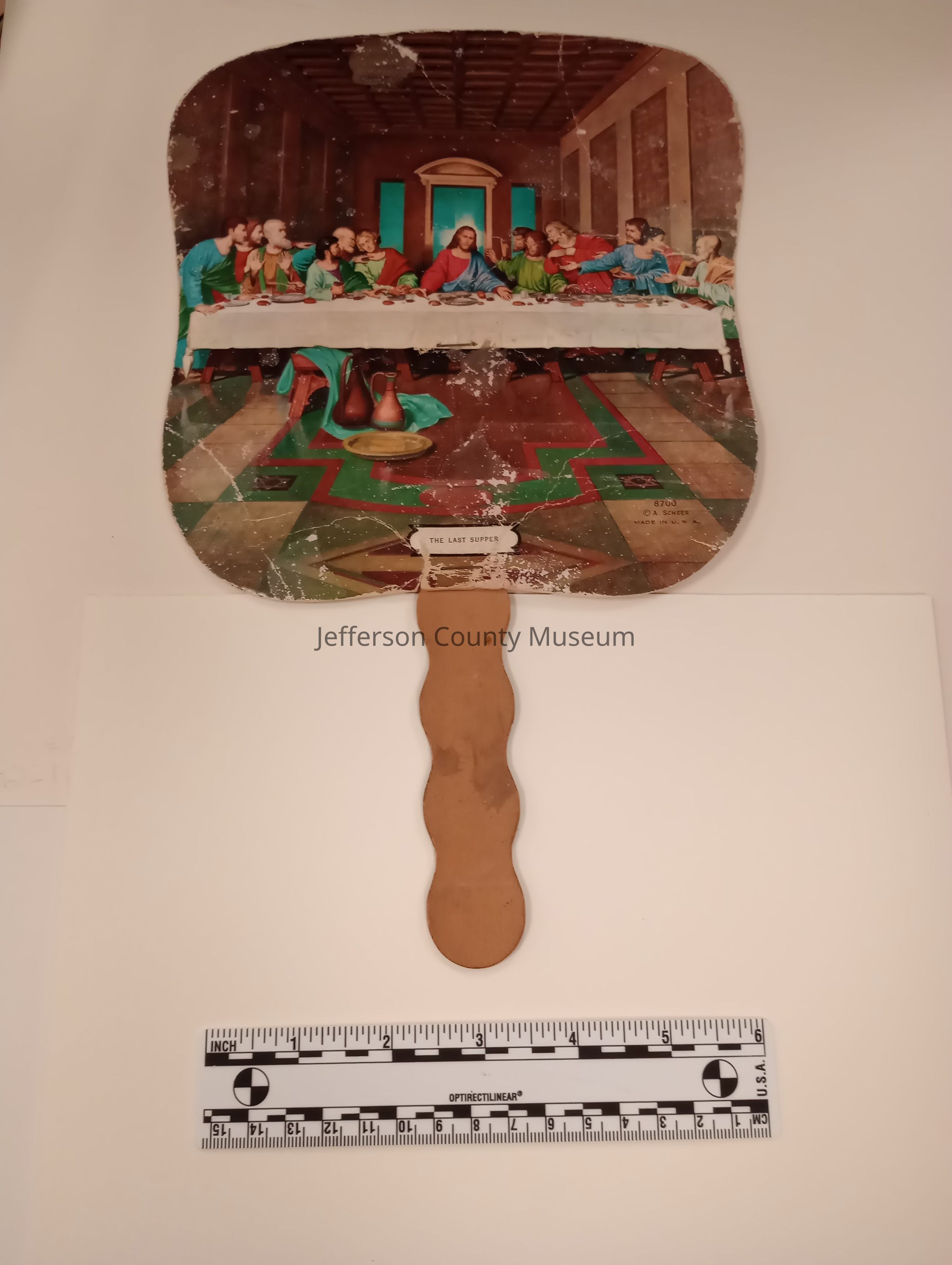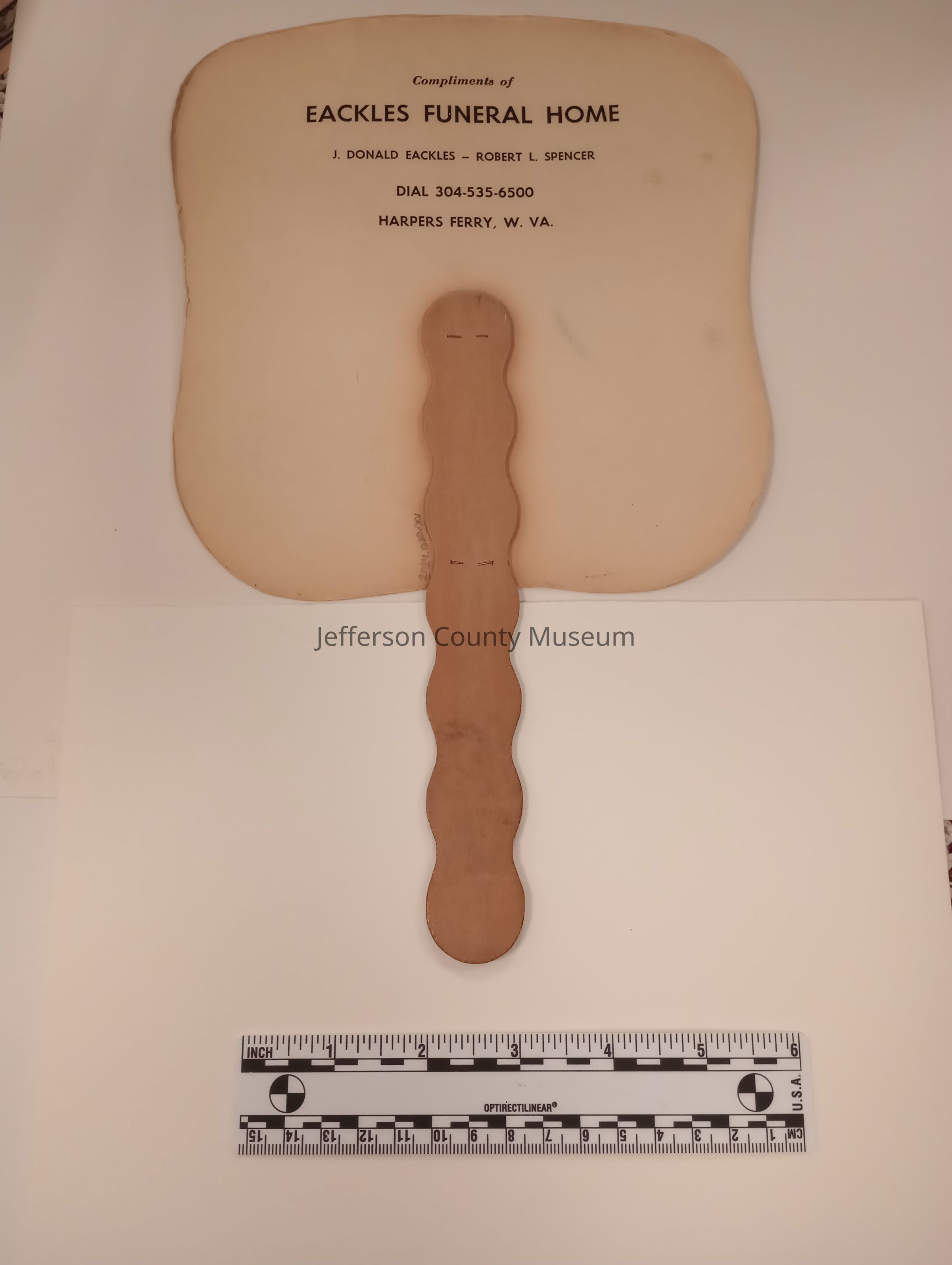 Paper fan from Eackles Funeral Home on wooden stick. On one side is an image of the Last Supper, on the other is an advertisement which says "Compliments of Eackles Funeral Home/ J. Donald Eackles -Robert L. Spencer / Dial 304-535-6500 / Harpers Ferry, W. VA."Acquisition