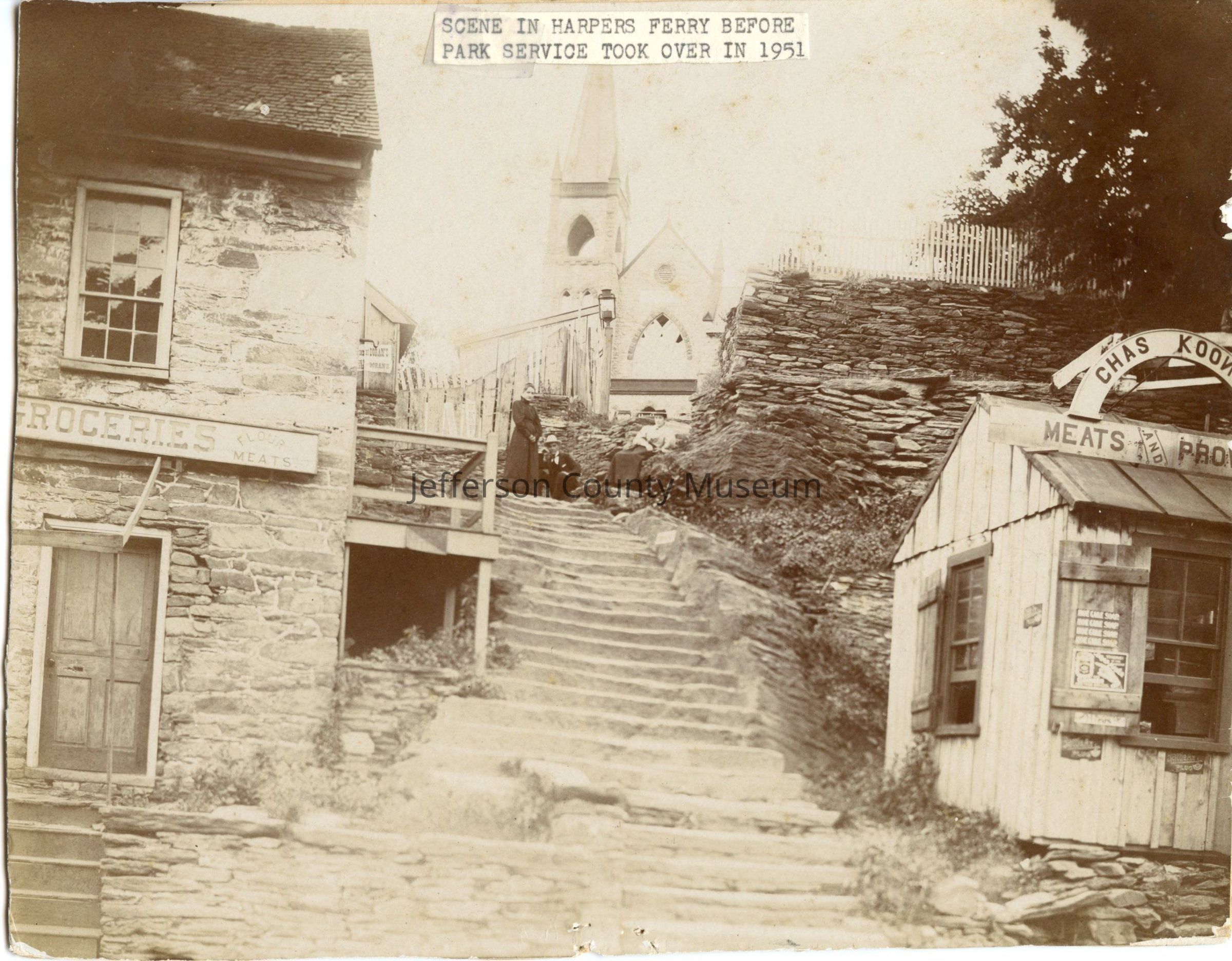 Scene in Harpers Ferry before the Park Service took over in 1951, c. 1900. Stone steps leading to St. Peter's Catholic Church. At the top of the steps is the oldest house in town, built by Robert Harper, founder of Harpers Ferry.Acquisition