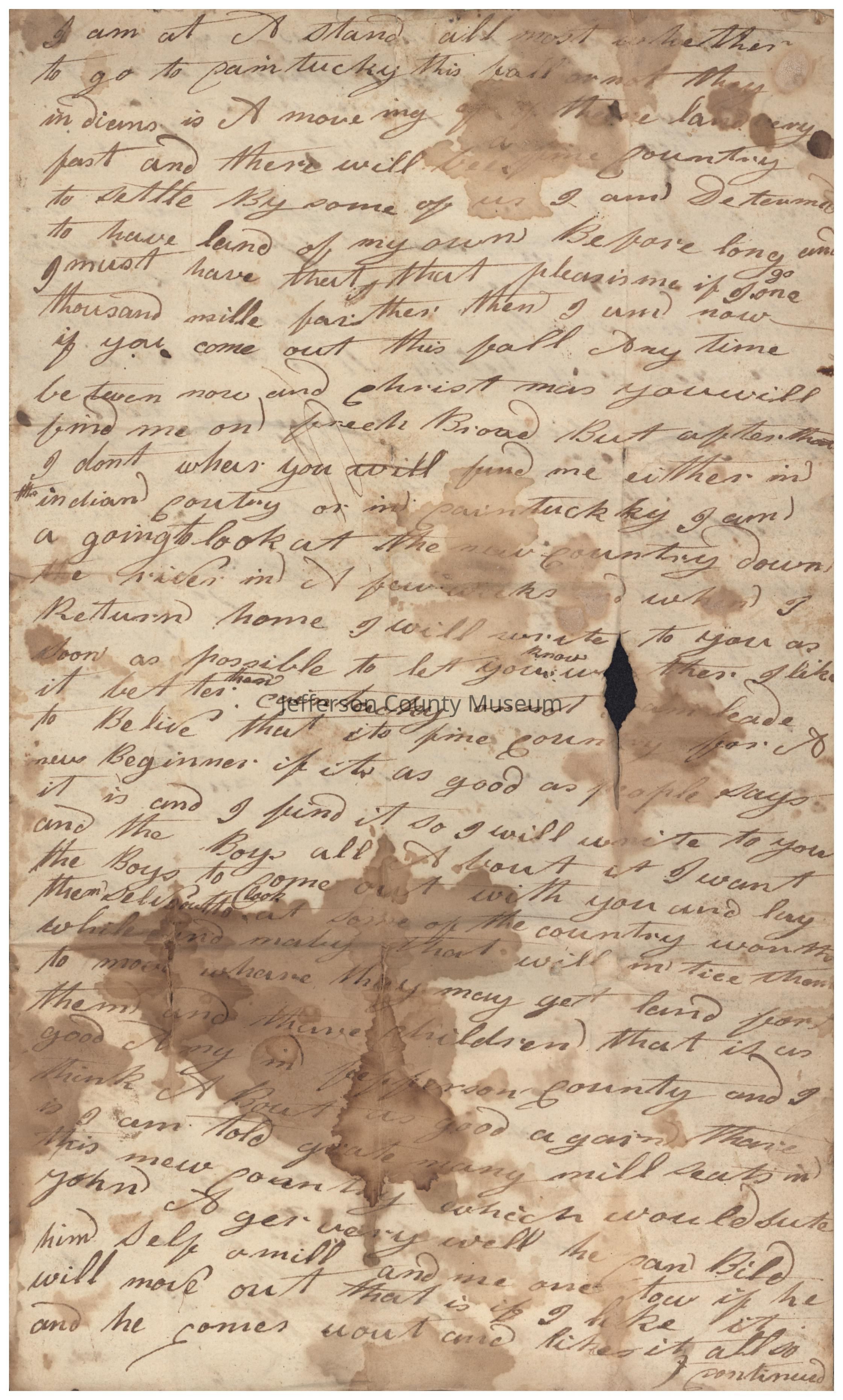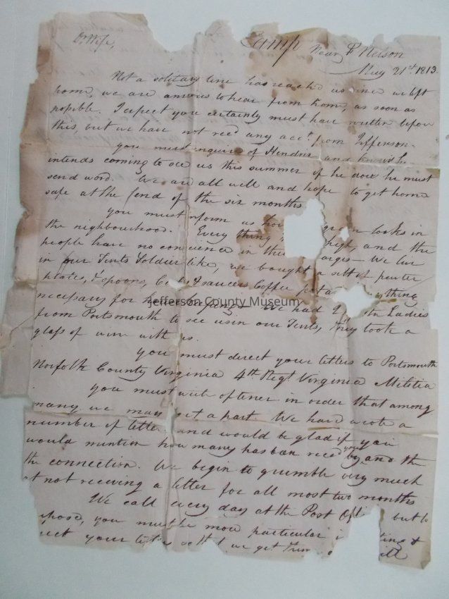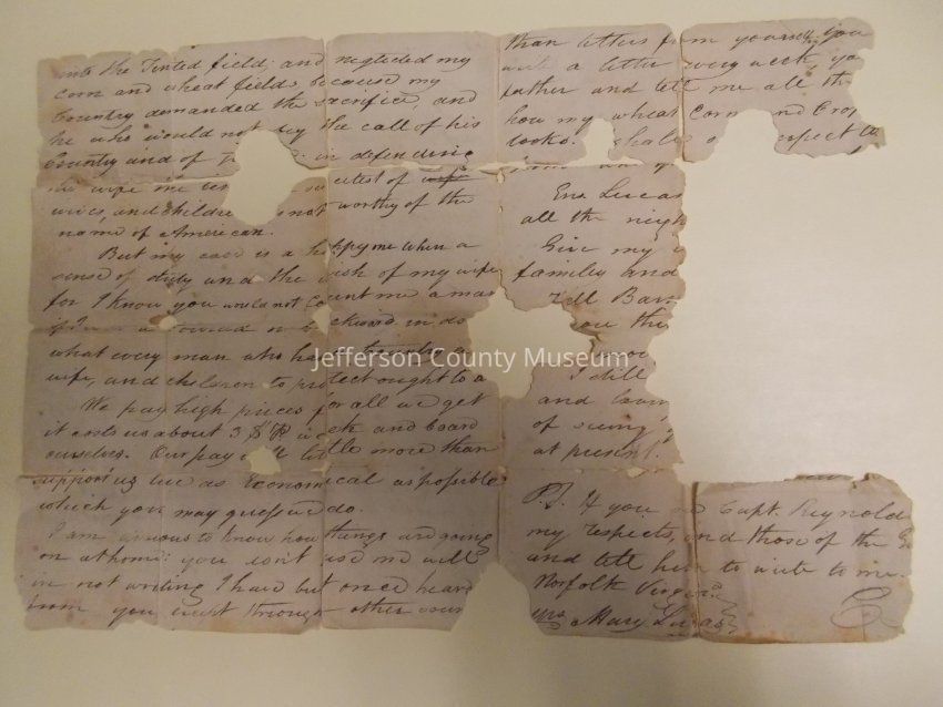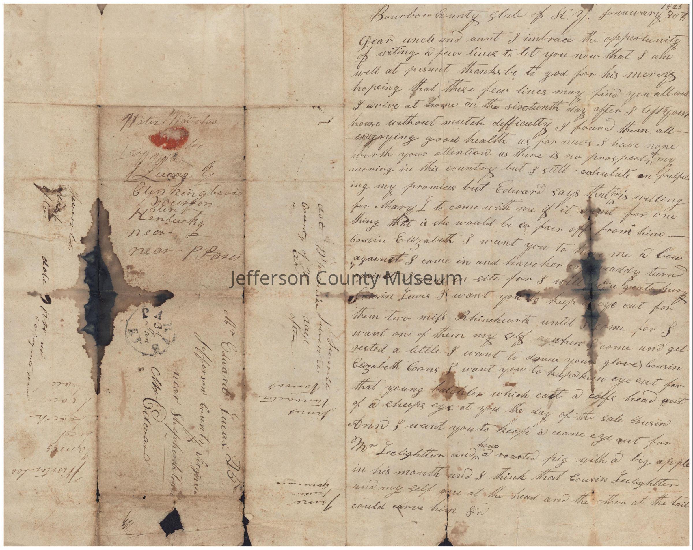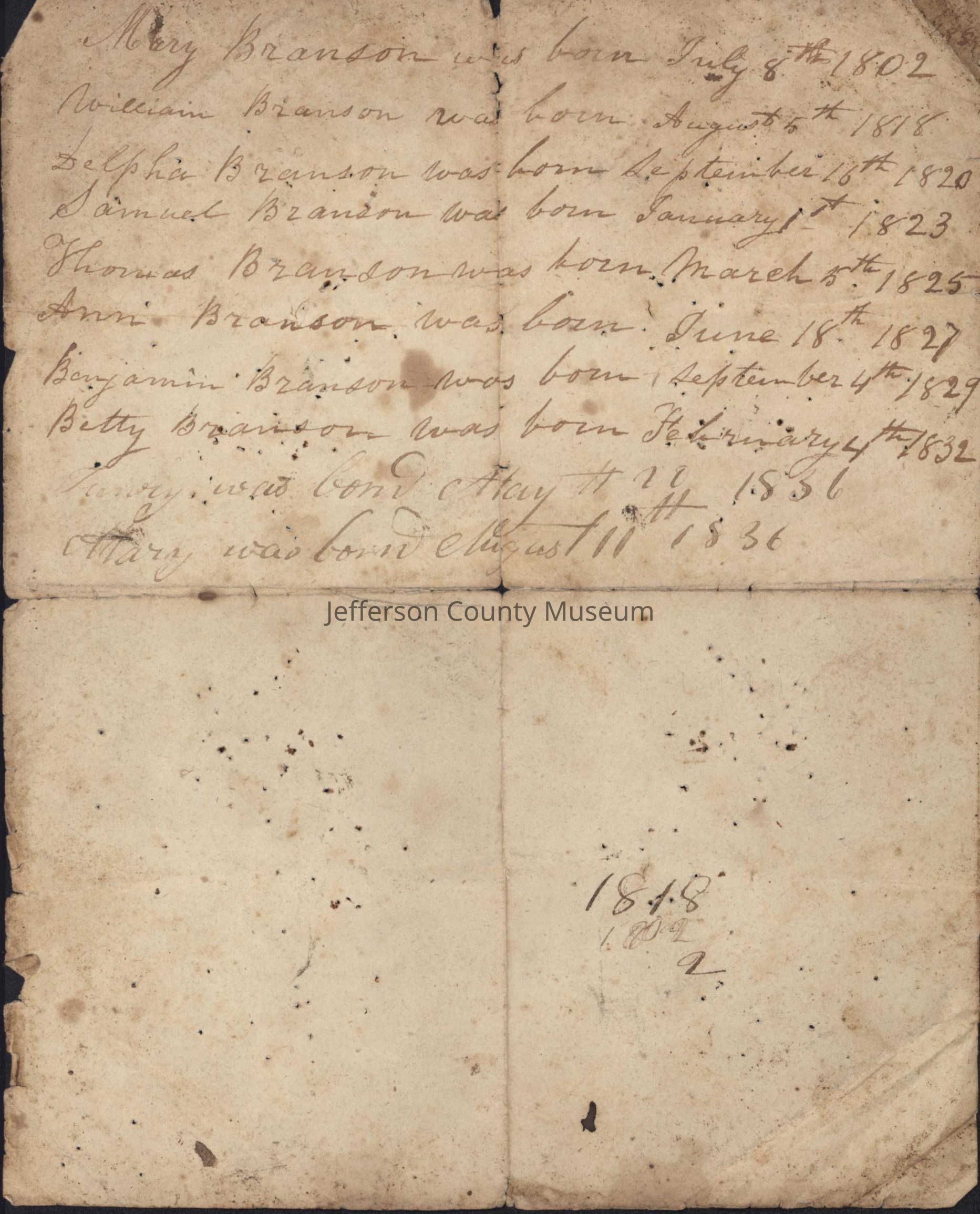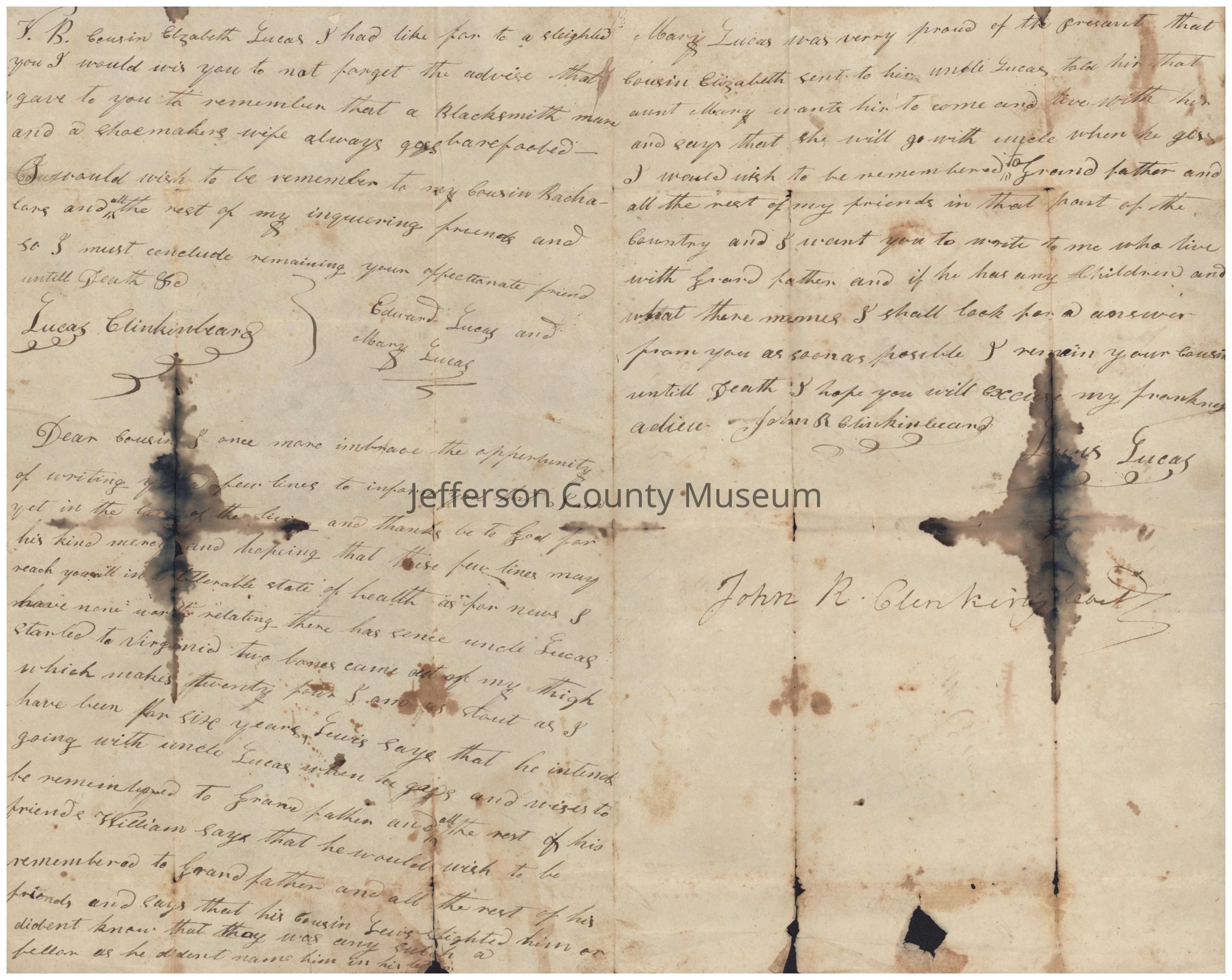 Unlike the rest of the collection, one folder (Folder 1) contains six original early 19th century documents. Five are letters dating from 1810 to 1826. Three letters (LF2,3,4) dated May, June, and July, 1813, are from Edward Lucas to his wife Mary Lucas, written from three different camps while he was a soldier in the War of 1812. An 1810 letter (LF1) is a communication among members of the Clinkenbeard (also Clinkinbeard) family. The final letter (LF6), written in 1826 by Lucas Clinkinbeard, is two letters: one to Lewis Lucas (cousin) and one to Edward and Mary Lucas (uncle and aunt). The sixth document in Folder 1 is a list of names and birth dates (1802-1836) of 10 people with the surname Branson. Two of the 10 may be identified to an African American family. (Scans of these six documents are in images.)