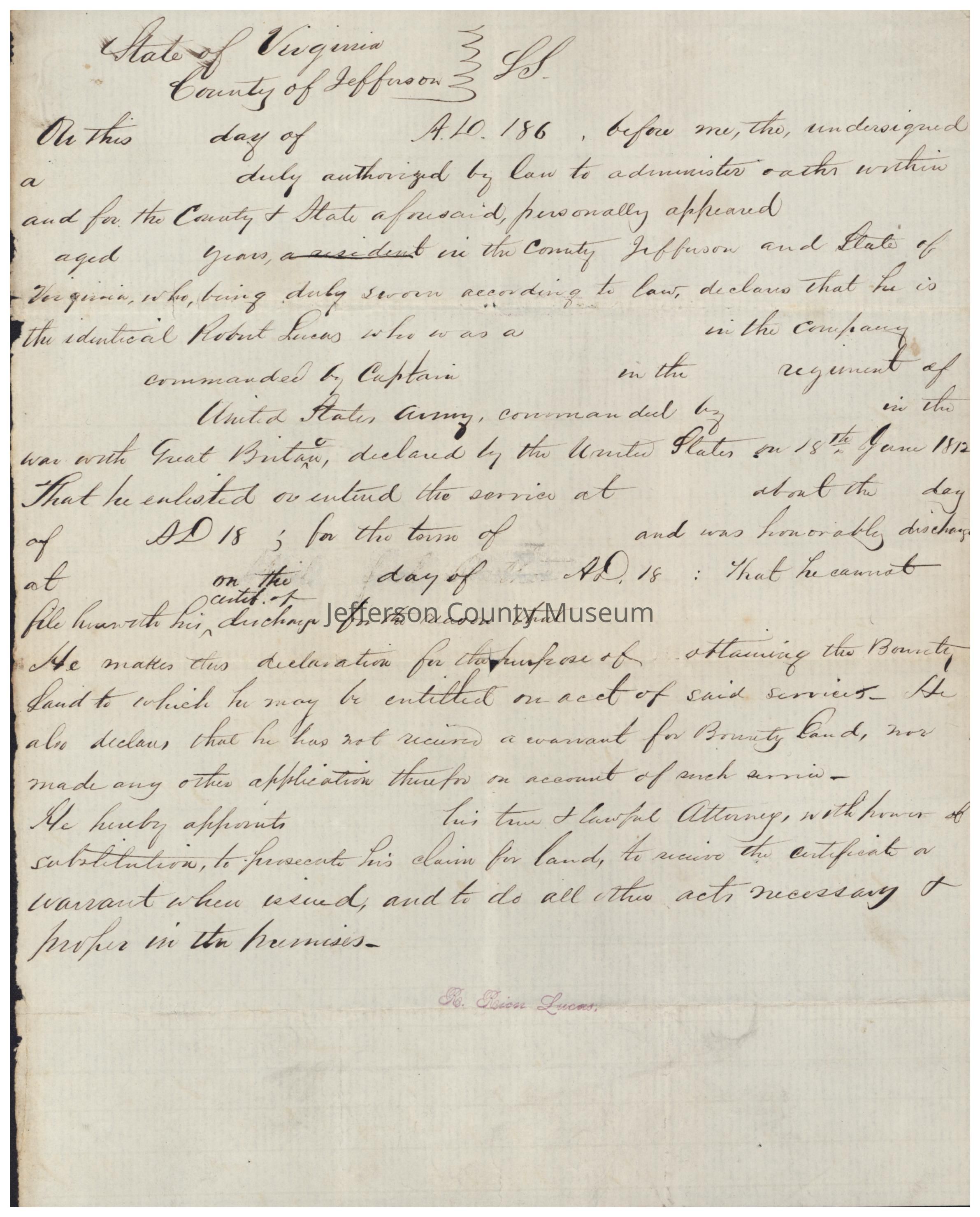 Folder 2: Edward Lucas veteran records and bounty land claim (LF7,8); Robert Lucas, incomplete oath, War of 1812 (See image LF9)