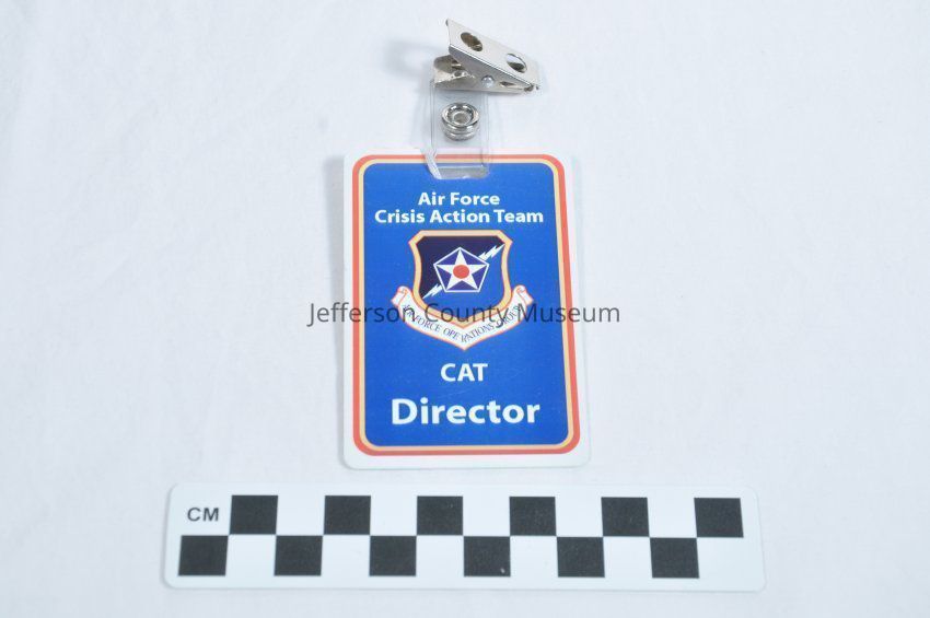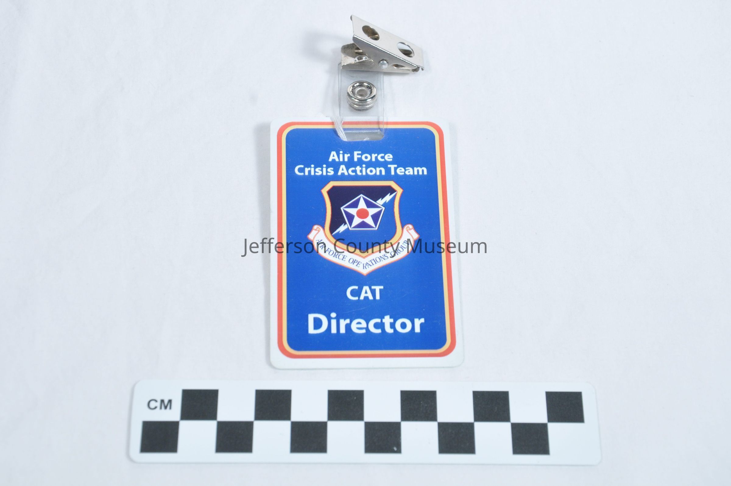 Plastic card the size of a credit card. Card has blue background with red and yellow stripe around edge. Text on card "Air Force Crisis Action Team CAT Director" In center is black and blue shield with white star with a red circle in center. Star is surrounded by a pentagon. Lightning bolt goes through pentagon. At bottom of shield is white banner with blue letters "AIR FORCE OPERATIONS GROUP". Card has a plastic tab attached with a clip for clipping on uniform.Acquisition
