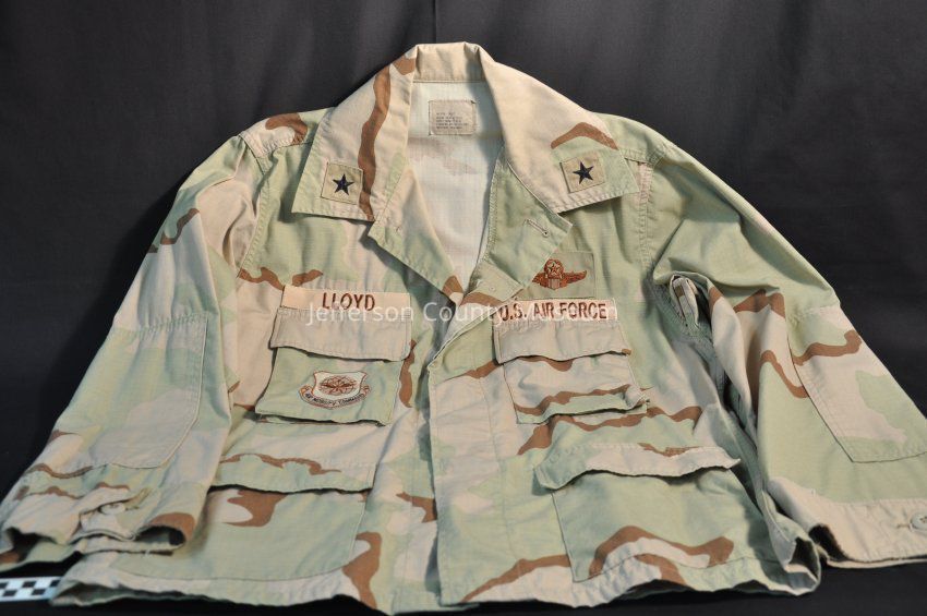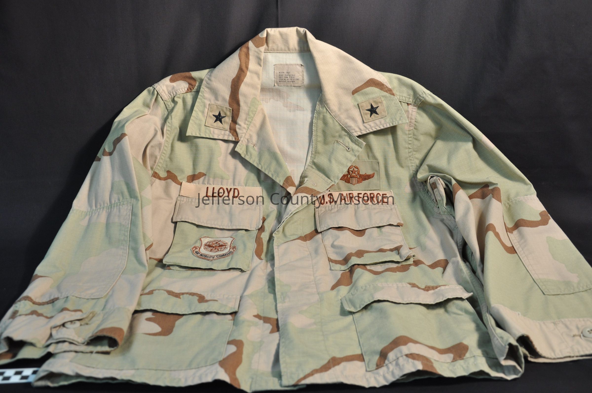 Beige, brown and light green desert camouflage field shirt, button front. Four button pockets. On right pocket is shield shaped patch in desert colors with globe with demarcation lines and spread wings with three crossed arrows superimposed. In a banner below the globe in black letters is "AIR MOBILITY COMMAND". Above right pocket is name tag with "LLOYD". Above left pocket is sewn on tab with "U.S. AIR FORCE". Above that is patch with spread wings with shield in center. Above shield is star with wreath around it, the insignia of a master pilot. At the end of each collar tab is a sewn on star. Sewn to inside right pocket is label with "COAT, DESERT CAMOUFLAGE PATTERN, COMBAT". Below that is contract number and manufacturer name and wearing and washing instructions. Label inside below collar has sizes and stock number.Acquisition