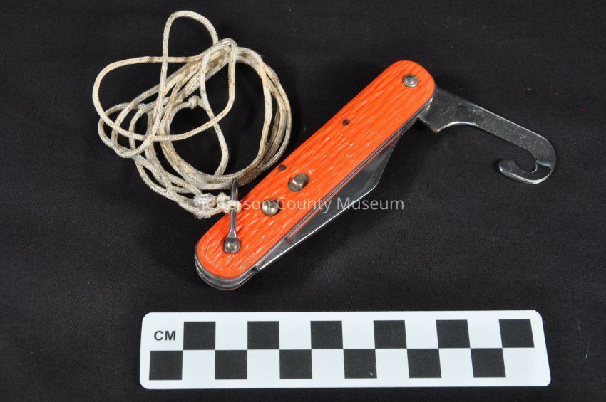 Orange handled survival knife with one switch blade and a hook type blade (riser cutter) on the other end for cutting straps of parachute risers or safety belt. Knife has a bale or handle for clipping to belt. Long nylon string attached to the bale. At the base of the straight knife blade "SCHRADE WALDEN N.Y. U.S.A. STAINLESS".Acquisition
