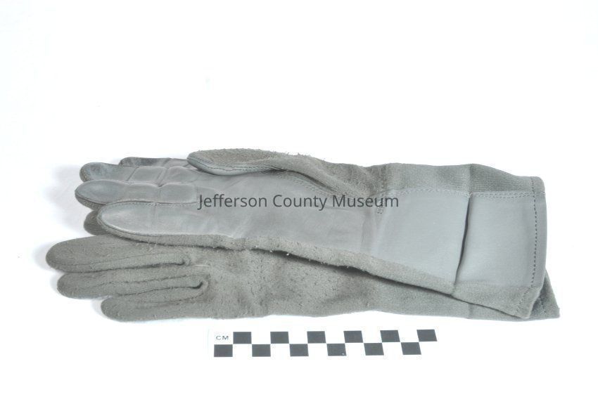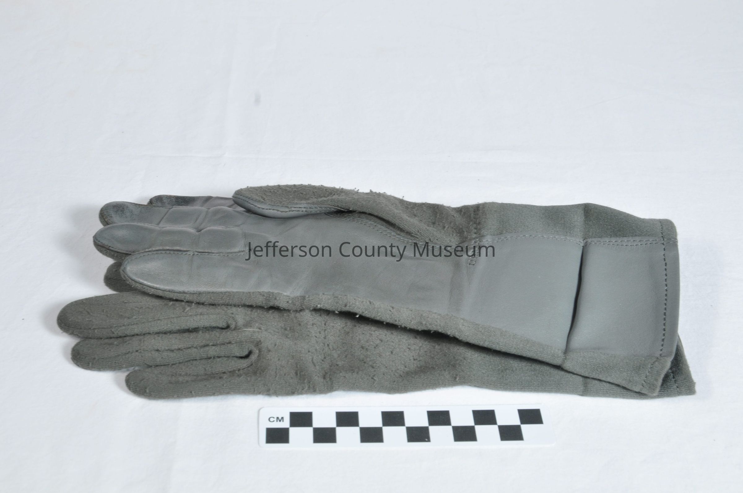 Pair of gray nomex (fire resistant) and leather gloves. Length of gloves takes them up the arm above the wrist gauntlet style. Leather is sewn to the palm side the entire length of the glove. Stamped inside each glove are stock numbers and a message about the fire resistant qualities of the glove.Acquisition