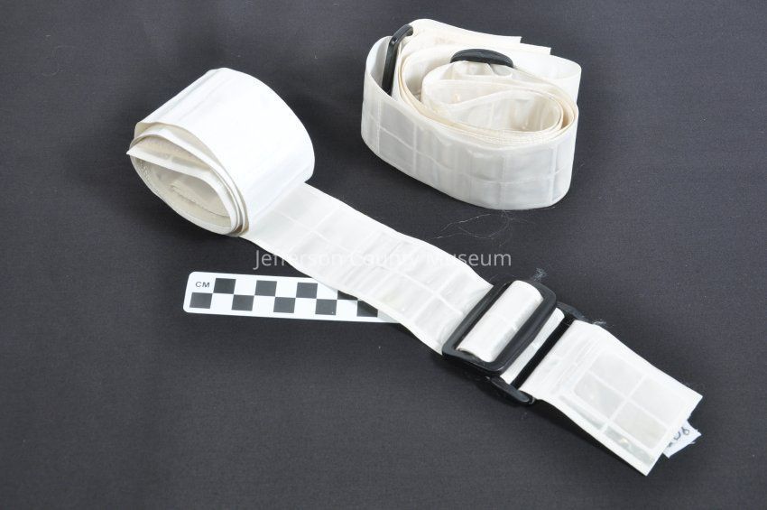 Two white vinyl reflective belts for use on flight line to make wearer visible in low light situations. Has velcro closure and two black plastic buckles. The larger buckle is used to make belt shorter. The smaller buckle holds one end of belt with velcro hook material. Stamped on one end of belt is long serial number and "BELT, HIGH VISIBILITY REFLECT-A-LIFE (206) 572-6431.Acquisition