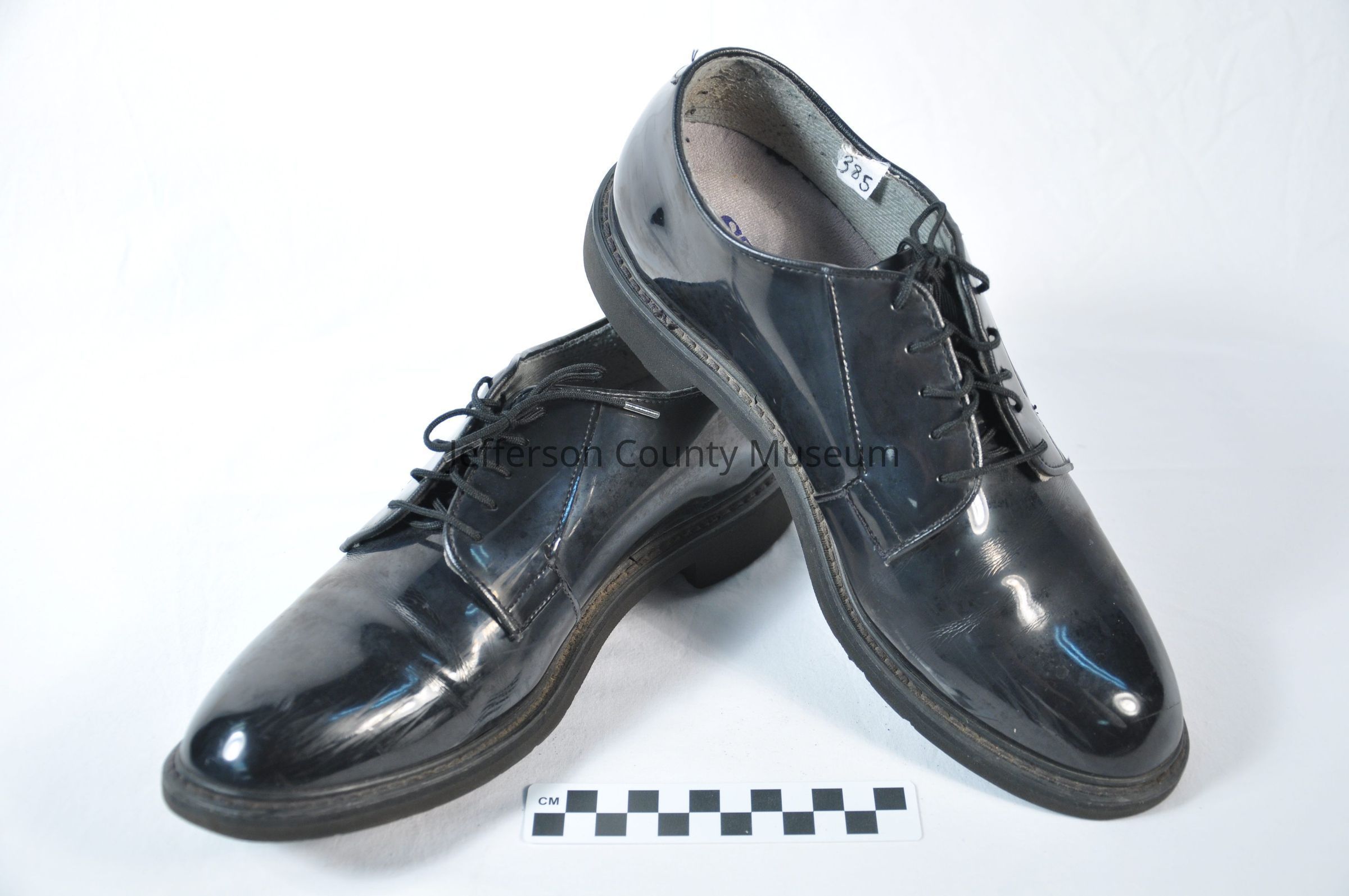 Black, patent leather U.S. Air Force dress shoes with laces. Rubber or dense foam material for soles. Embossed on the sole is "OIL RESISTANT - NON MARKING". On the instep is "Bates Lites 50% LIGHTER 75% COOLER". Inside on the heel is "BATES TM". Inside on tongue is white label with "BATES UNIFORM FOOTWEAR" and serial numbers and size.Acquisition