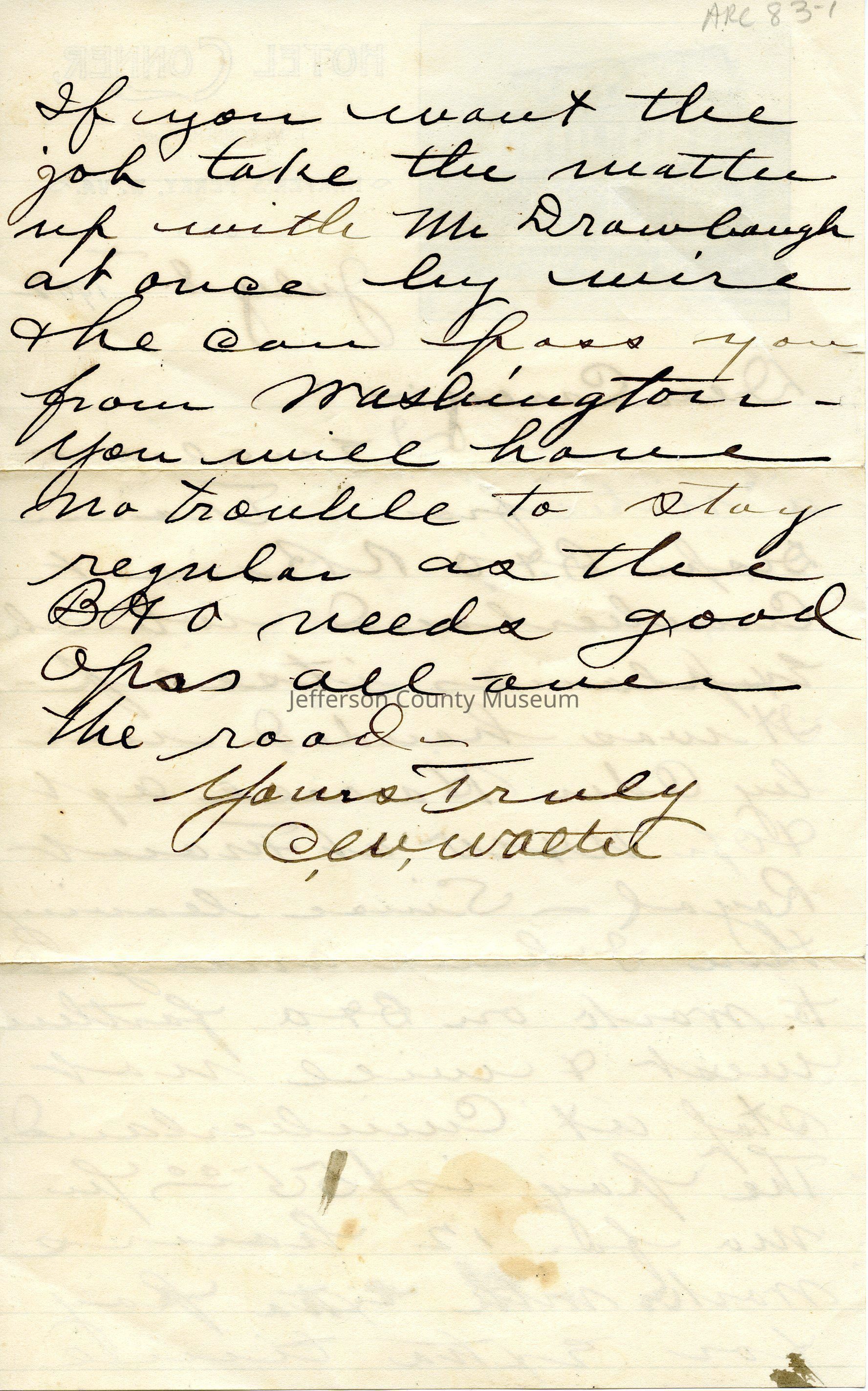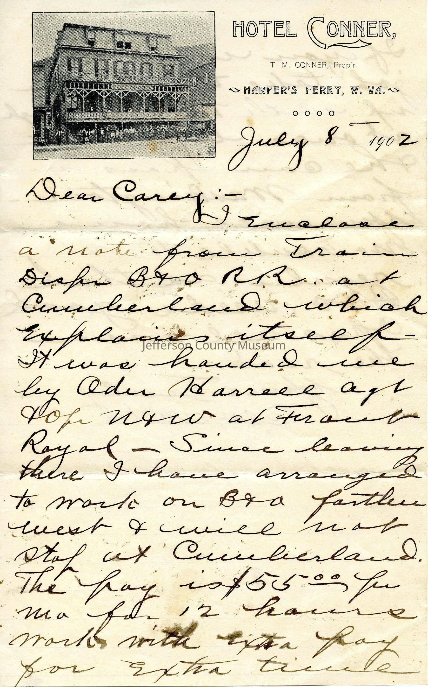 Correspondence written on Hotel Conner (Harpers Ferry, West Virginia) stationery to Mr. Cary Saffell ?, Culpeper, Virginia from C.W. Walter ? regarding B&O Railroad. Dated July 8, 1902. (83-1).