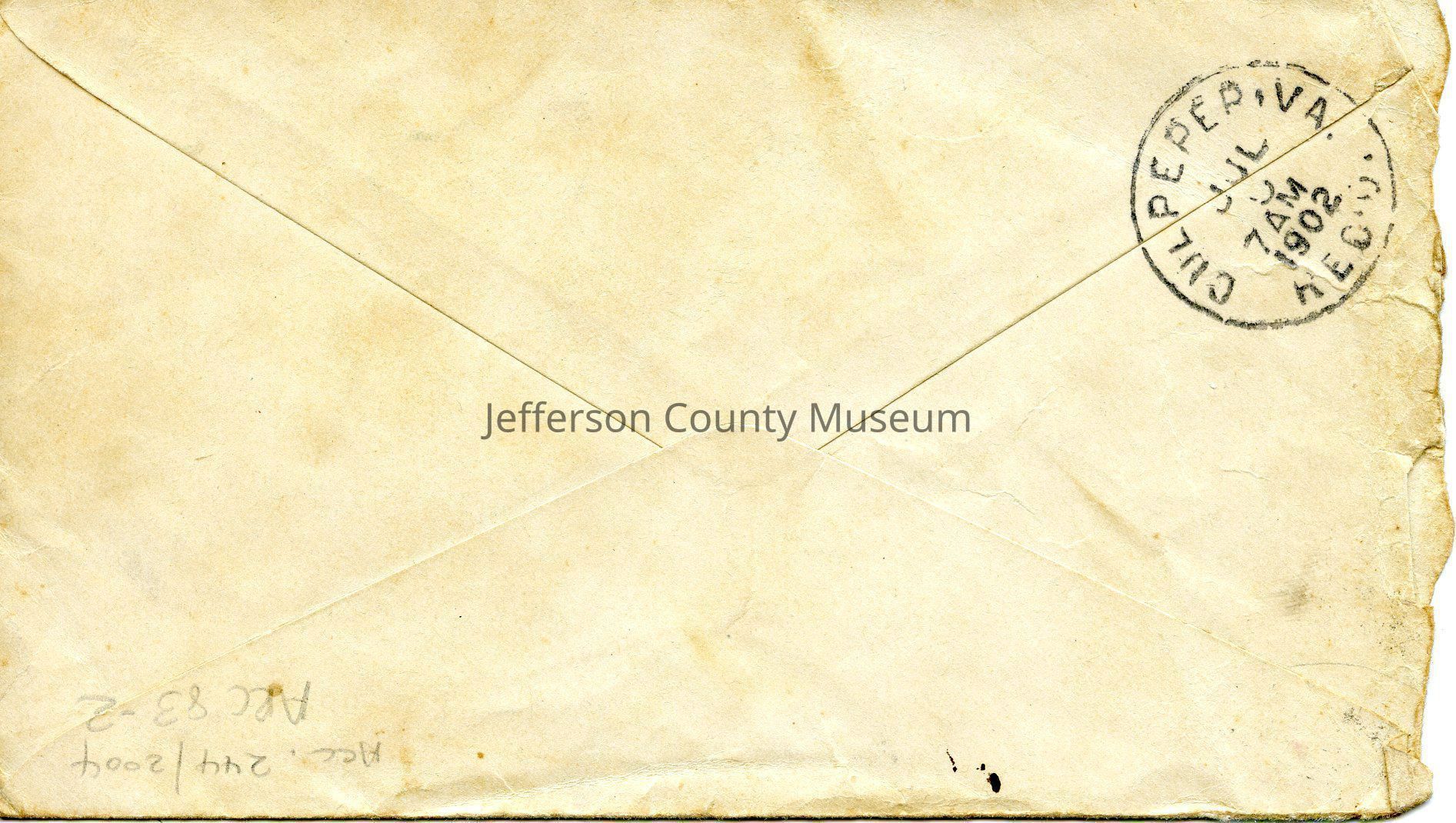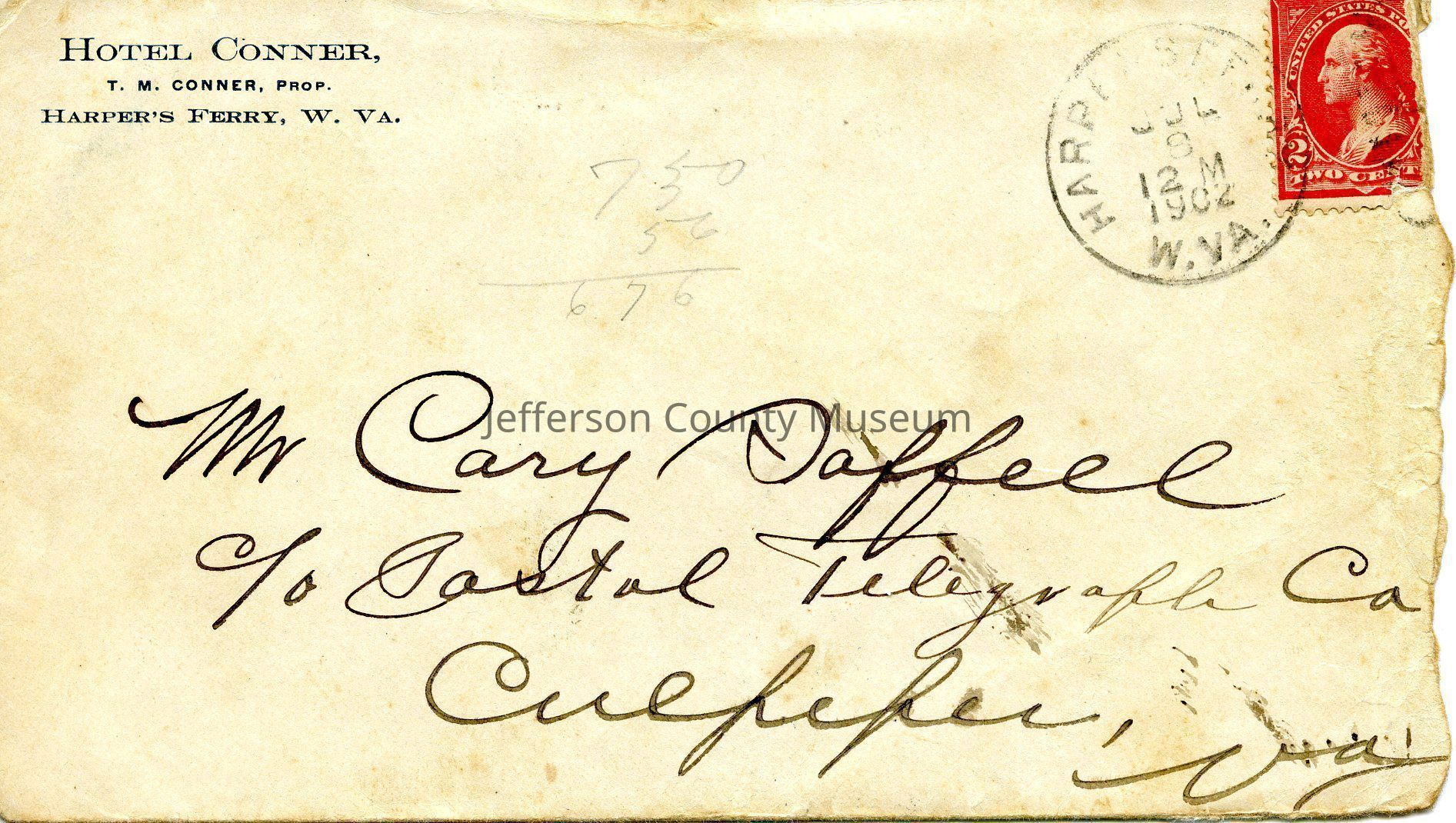Envelope with Hotel Conner return address. Affixed is a 2 cent stamp, postmarked from Harpers Ferry July 8, 1902, 12 M. Also a postmark on the back from Culpeper, Virginia dated July ?, 1902, 7AM. (83-2)
