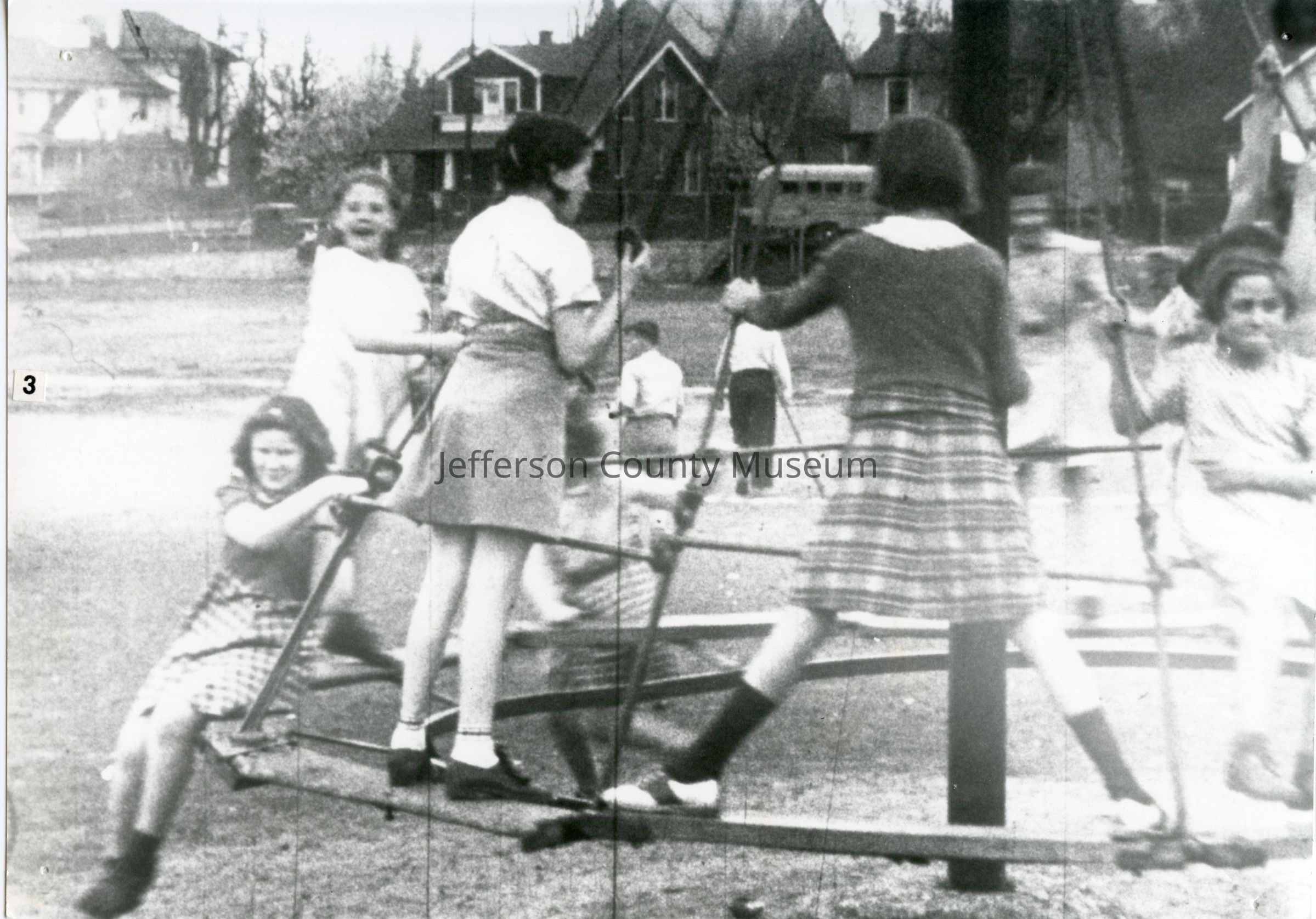 School children on playground at Wright Denny Elementary School, riding the Ocean Wave.