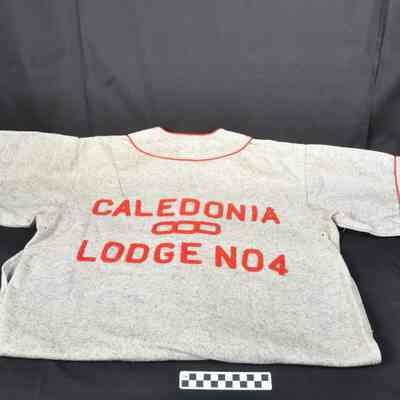 Short sleeved, light gray colored wool baseball uniform with red piping on shirt and pants and red letters on shirt front and back. Button front on shirt and button fly on pants. Four ventilation holes at each armpit and four ventilation holes at crotch of pants. Pants are shortened to come above ankles and are elasticized. Belt loops on front of pants and one large loop on back. One pocket on back right of pants. "RED BIRDS" on front of shirt. "CALEDONIA OOO LODGE NO 4" on back. Label on inside shirt at collar "Raleigh CO. NEW ROCHELLE, N.Y. 38". Label inside pants at back waistband "34". Label inside right side waistband "WOOL 26% COTTON 74% M'F'G BY RALEIGH CO.". Name written in ink on waistband "STARRY".Acquisition