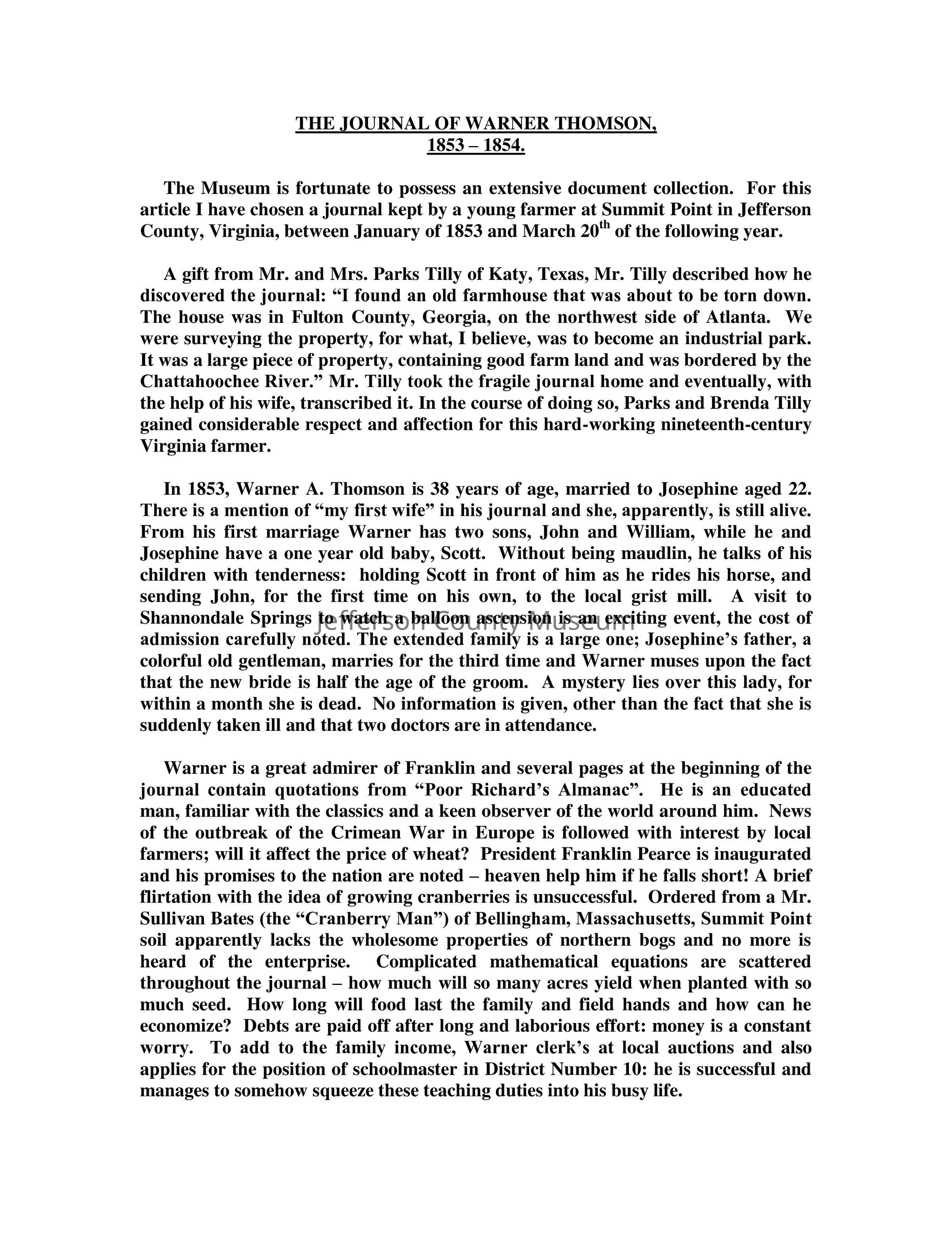 Diary of Warner A. Thomson, a farmer in Summit Point, Virginia, kept from January 1853 to March 20, 1854. With typewritten transcription by Parks and Brenda Tilly.