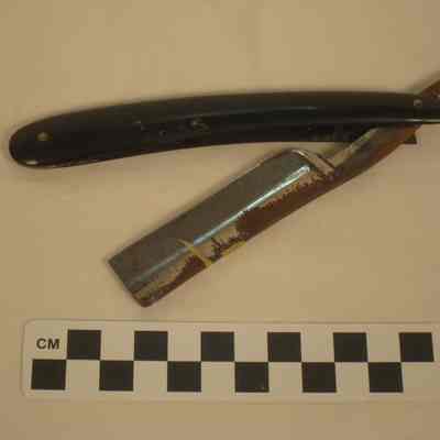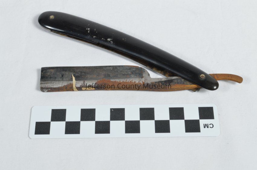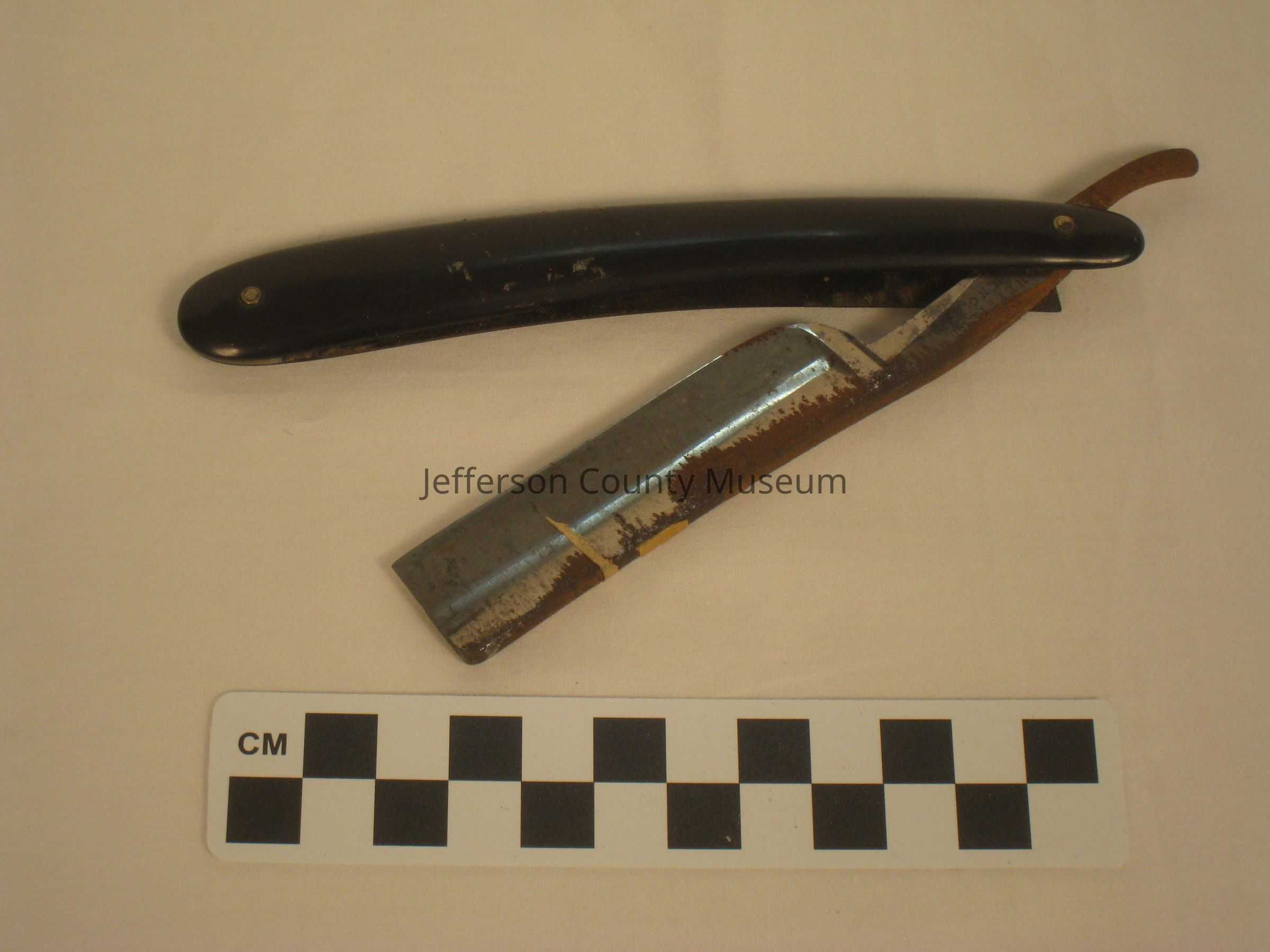 Razor with dark brown plastic or composite handle. Handle is broken on one side near where it is attached to blade. On one side of blade on shank "SHEFFIELD ENG.". On other side on shank "J. T. ALLERT & CO. WARRANTED".Acquisition