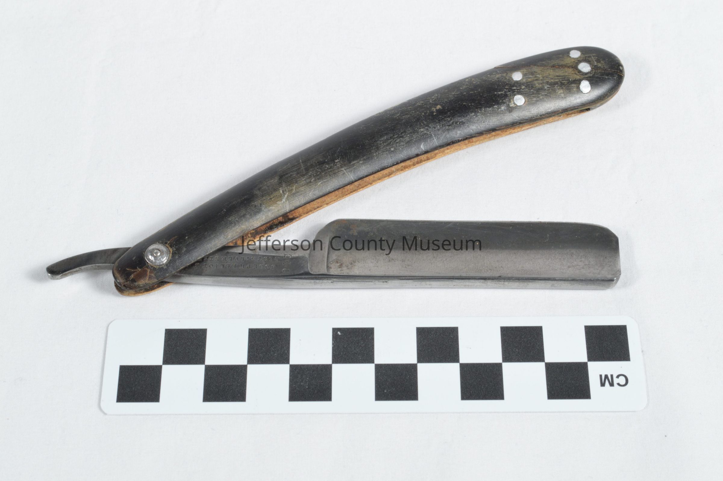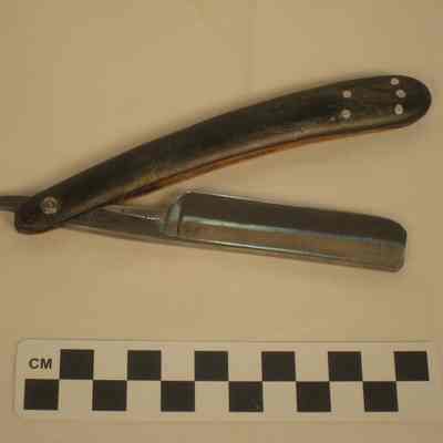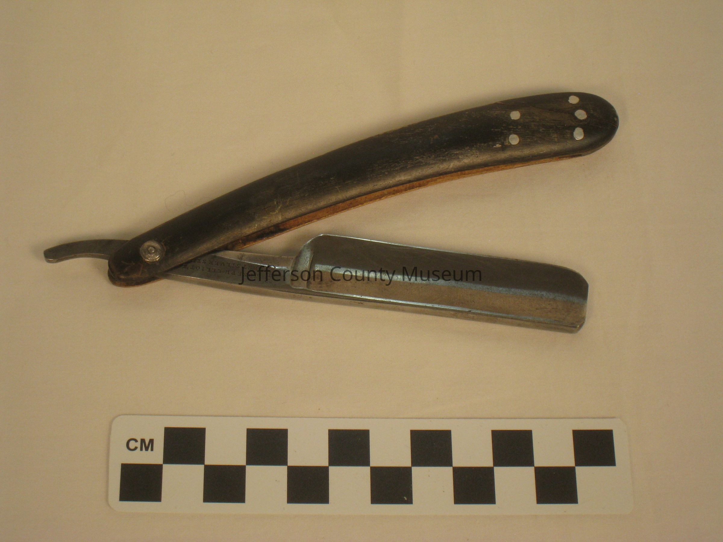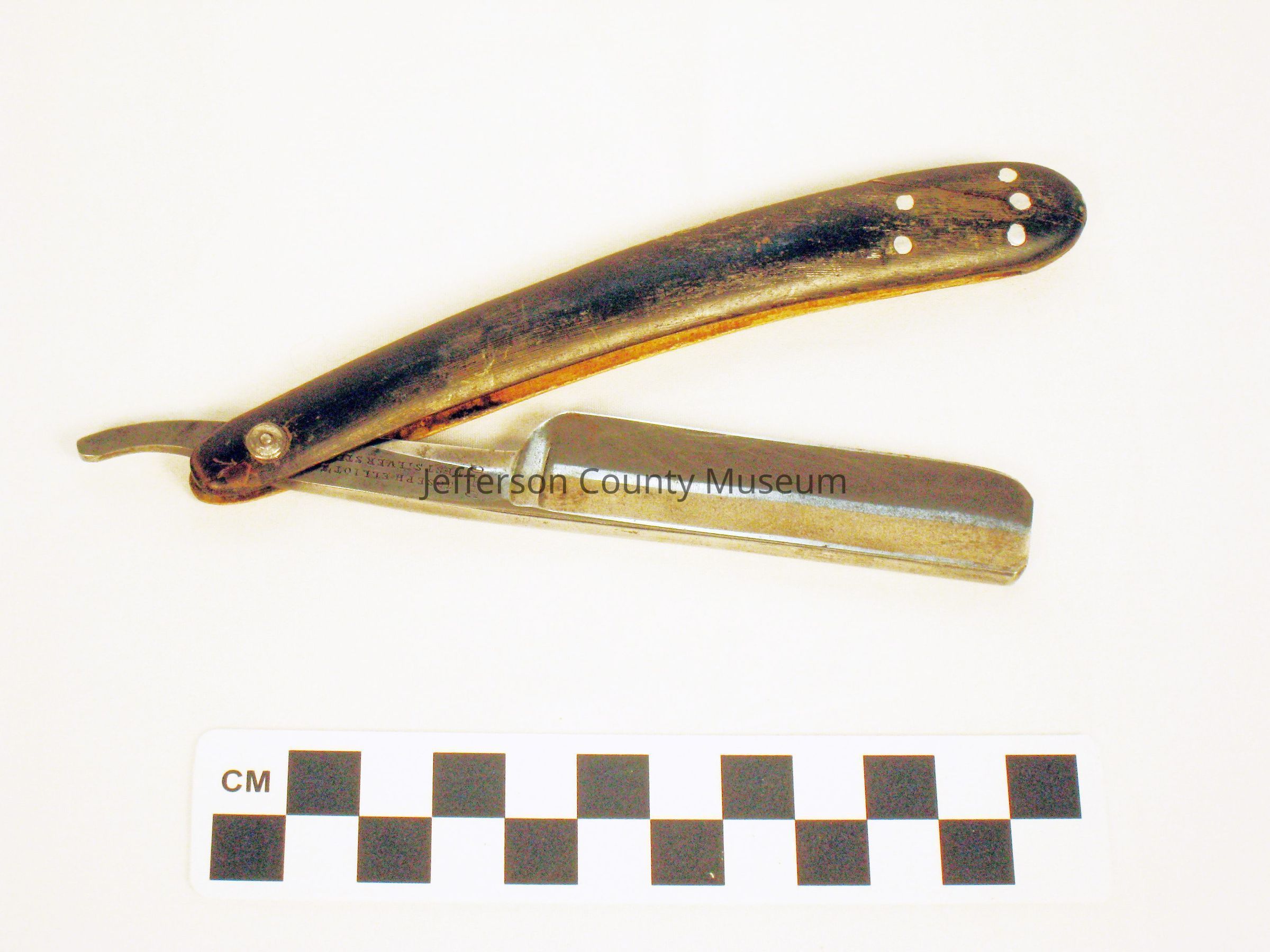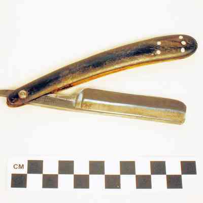 Razor with wood handle. Wood is light colored on one side and dark on other. On one side of shank "JOSEPH ELLIOT'S BEST SILVER STEEL".