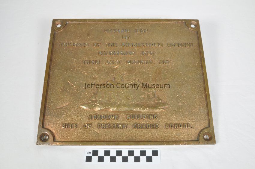 Brass plaque commemorating the Charles Town Academy. Chartered in 1797, the academy stood on the site of the original Wright Denny Elementary School building, which was destroyed by fire in May 1972.