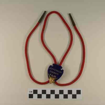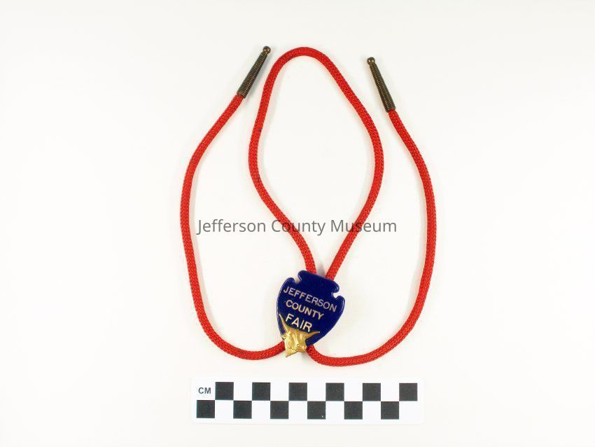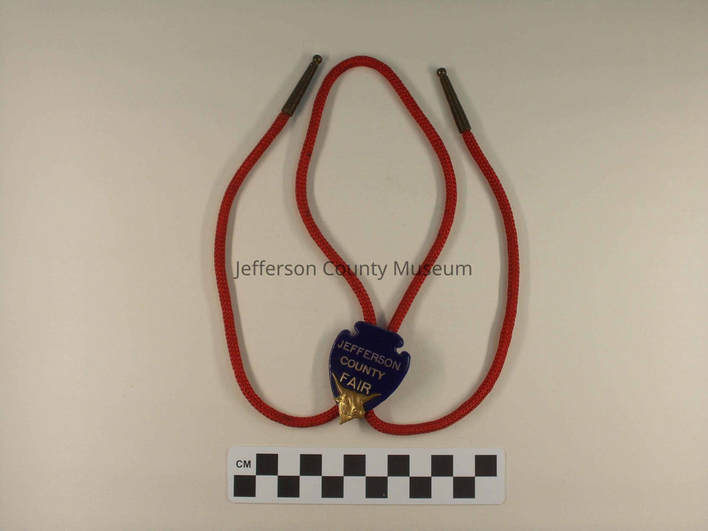 Red bolo tie with a shield-shaped slide. On the slide are the words "Jefferson County Fair", and underneath the words is a golden profile of a steer.Acquisition