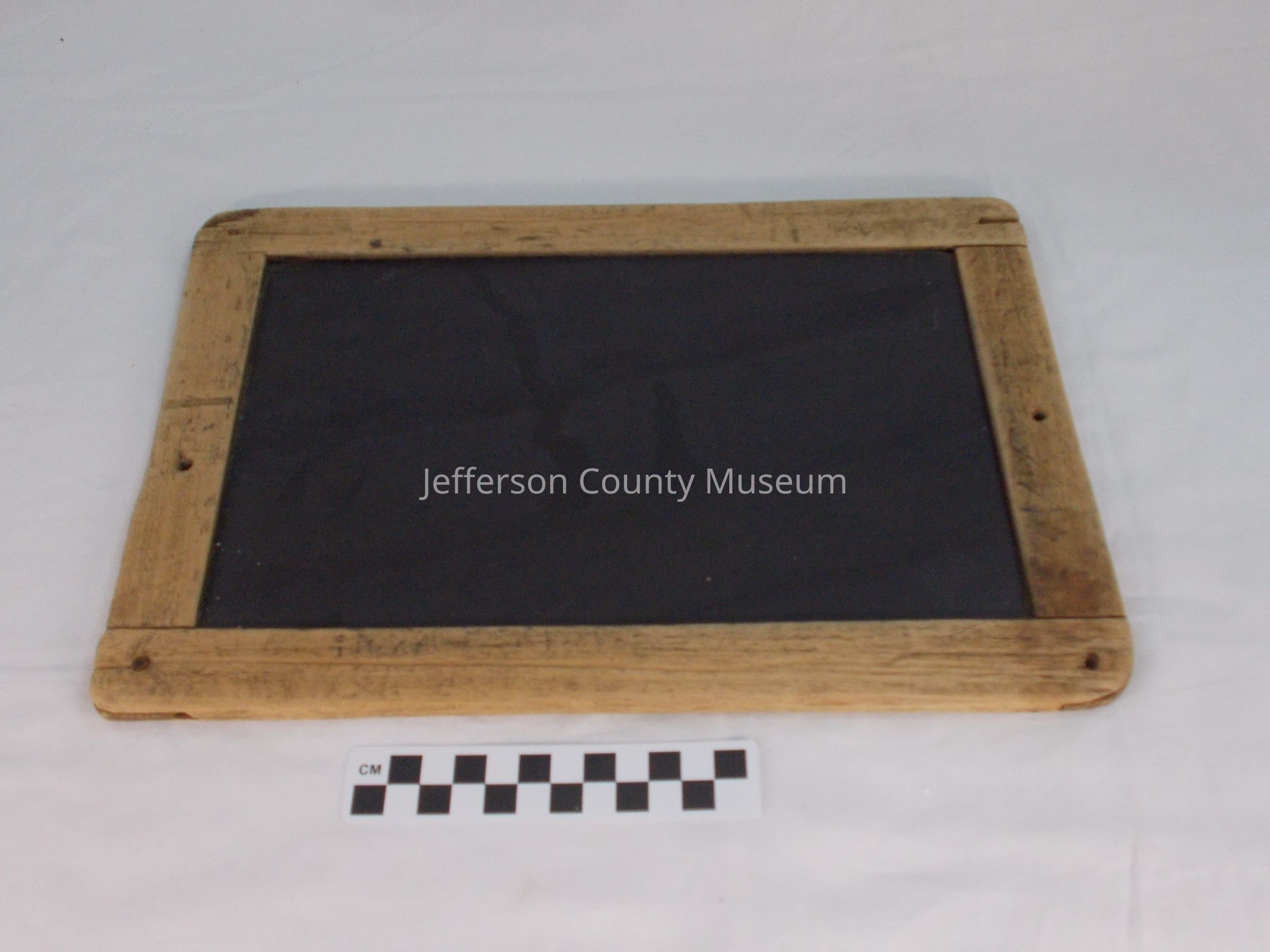 Writing slate used by Marianna Johnson Smallwood of Kabletown, who was a teacher at Fairmount School in the 1920s and 1930s. It has a brown wood frame with rounded corners.Acquisition
