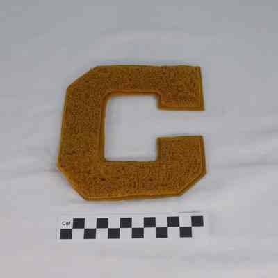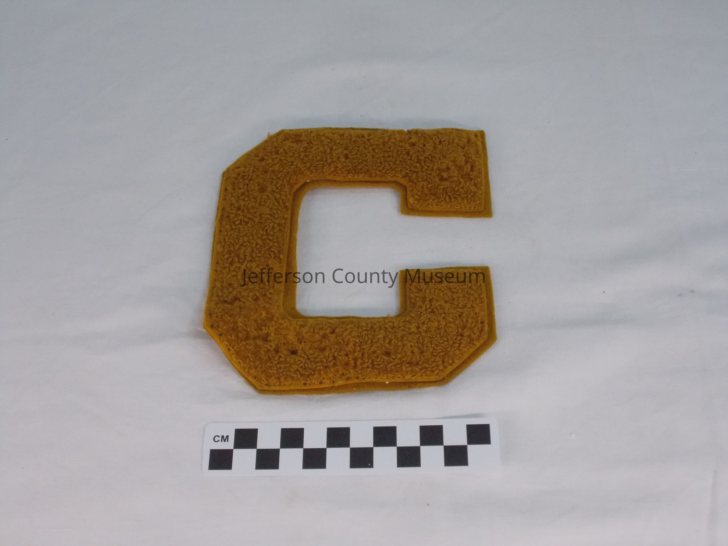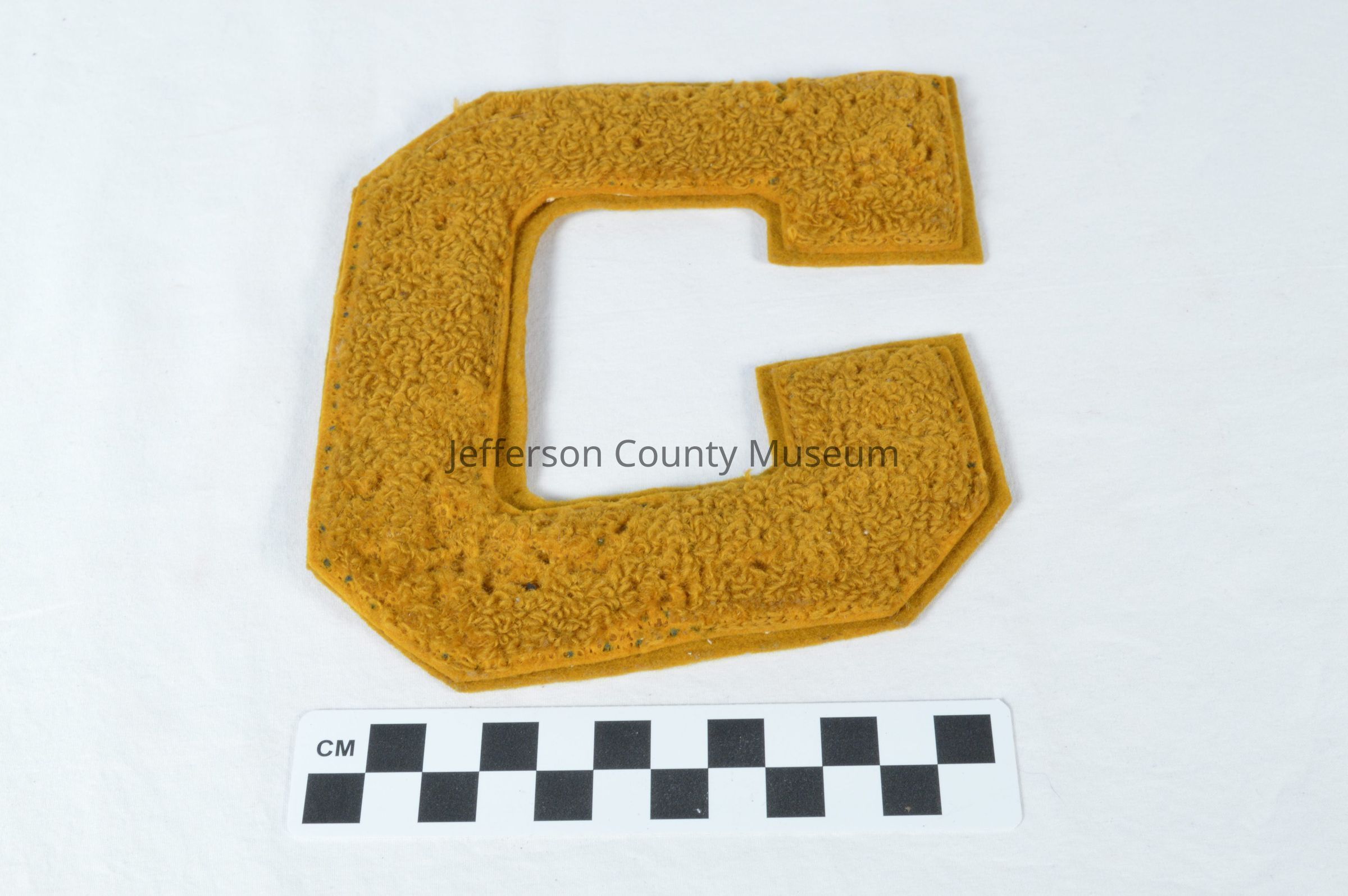 A letter "C" awarded to Kathryn Kershner for her participation on the Girl's Basketball team at Charles Town High School during the 1946-1947 school year. The "C" has a yellow felt backing, and the top of the "C" is stitched to give it some texture.Acquisition
