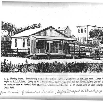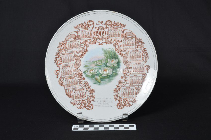 1909 calendar plate advertising L. J. Shirley store in Shenandoah Junction. Decorative plate which shows the 1909 calendar by month. January through June are on the left side of the plate, and July through December are on the right side of the plate. At the bottom are the words "Compliments of L. J. Shirley, GEN MDSR. Shenandoah Junction, W. Va." In the middle of the plate is a scene of flowers growing on lily pads in a pond. There is a double line of gold rimming around the outside of the plate.