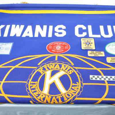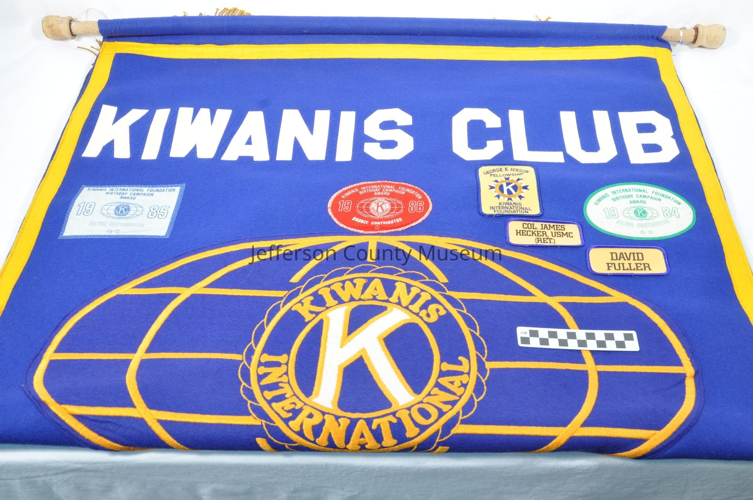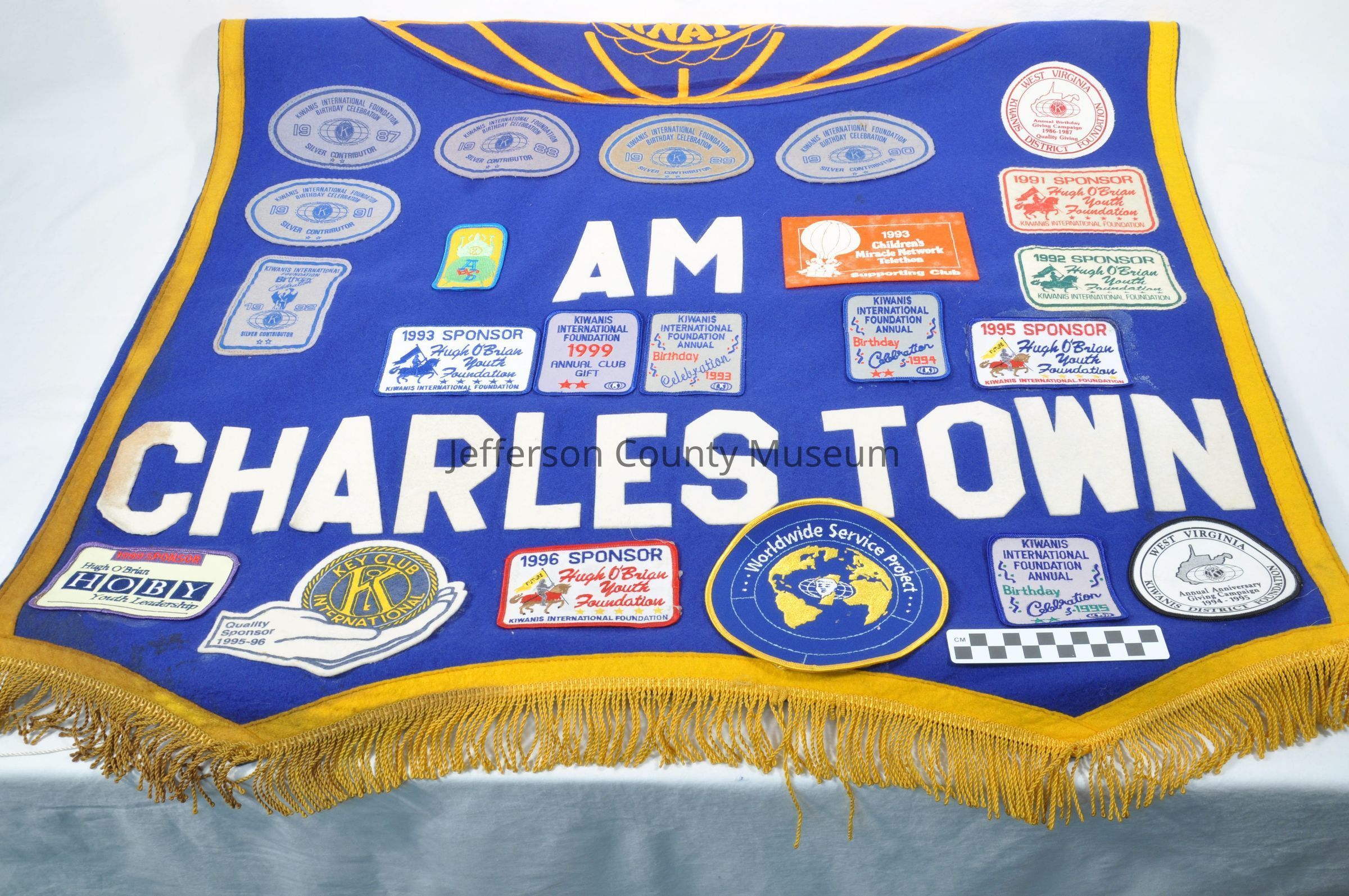 Blue felt banner used by the Kiwanis Club AM (Breakfast Club) of Charles Town, West Virginia. Patches for sponsors and programs attached to the banner range in date from 1985 - 1999. Banner is bright blue with yellow border and fringe on bottom. The top is attached to a wooden dowel and white string for hanging. White felt letters spell out: KIWANIS CLUB AM CHARLES TOWN, with the International Kiwanis symbol at center. See Notes for more information from donor.Acquisition