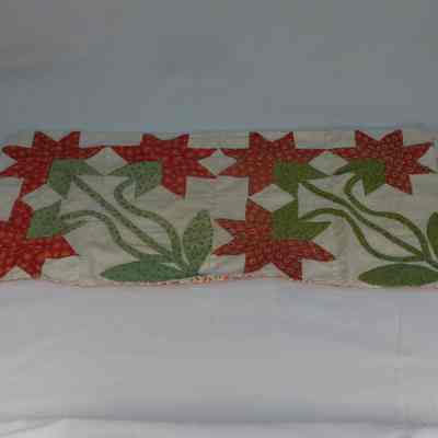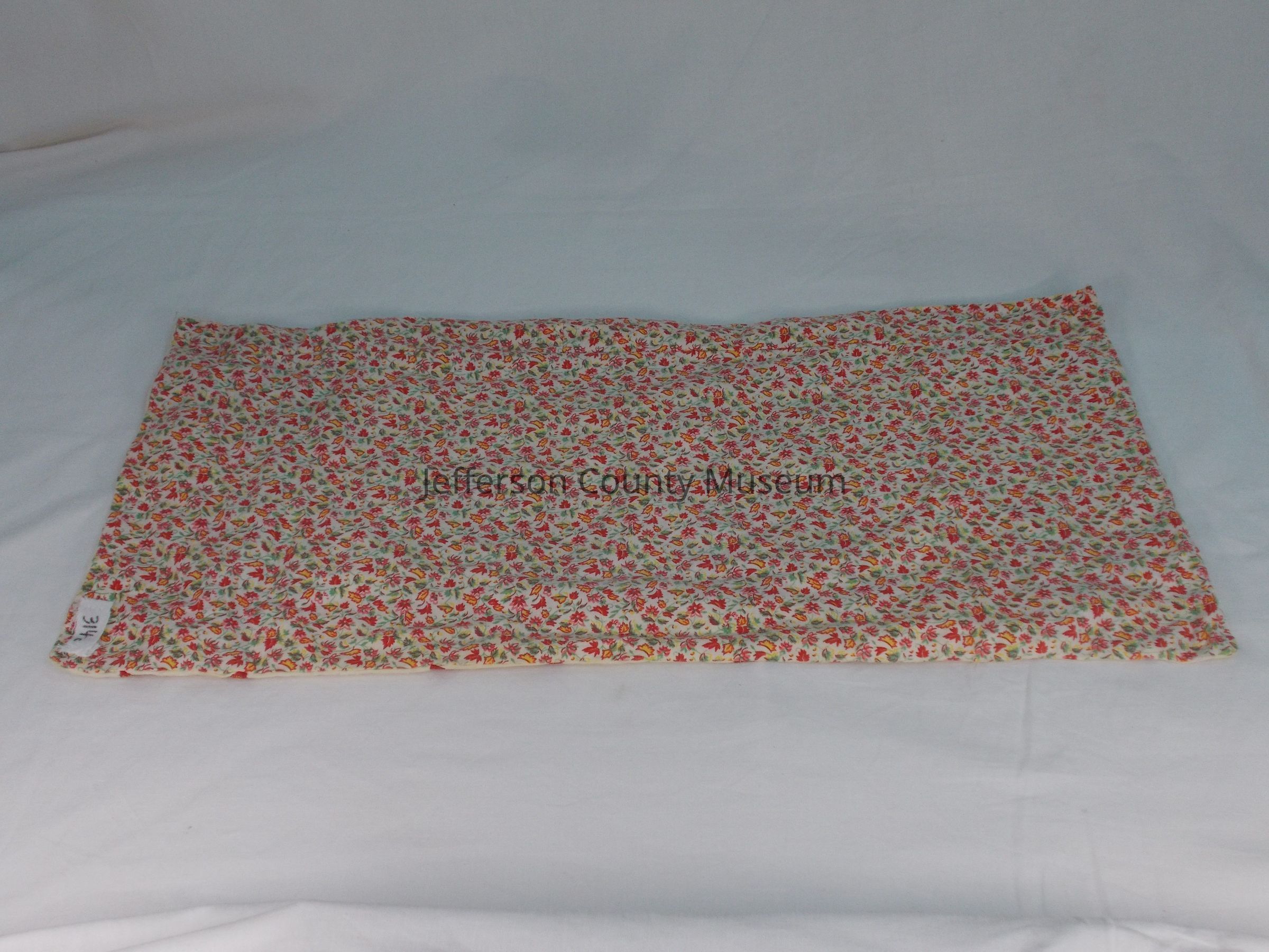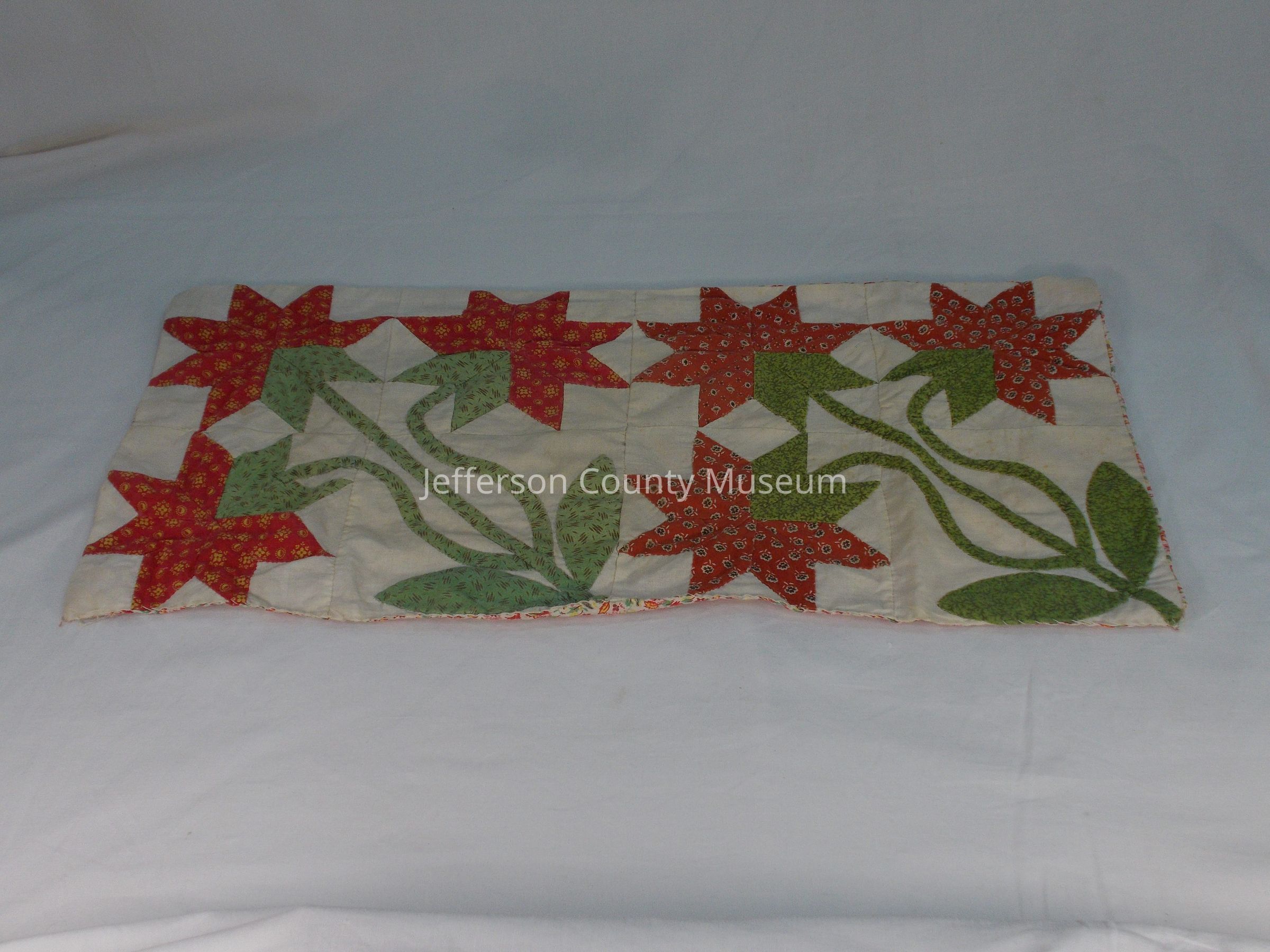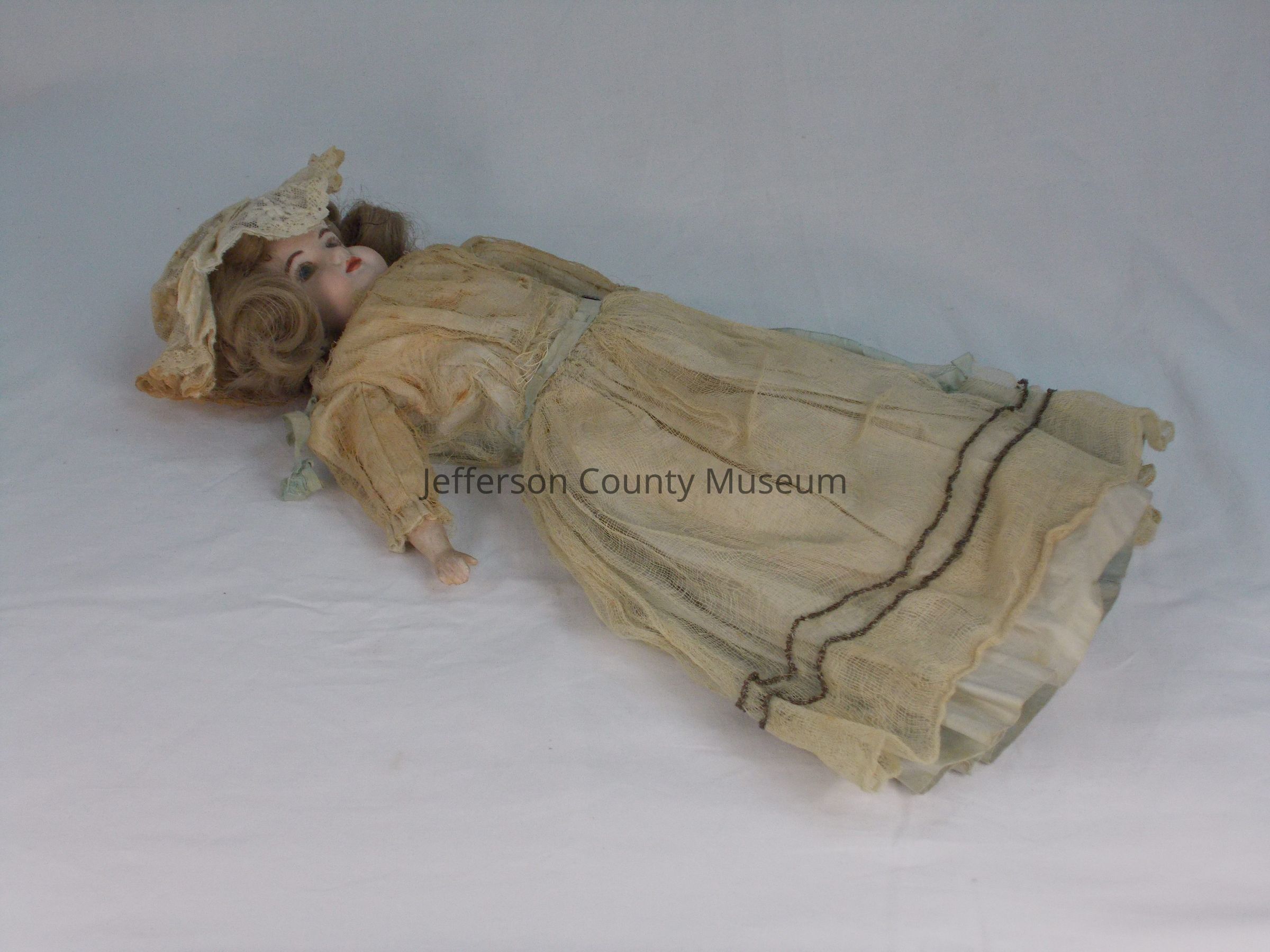 Doll has leather body with bisque face and hands and is wearing a fabric dress and lace hat (was attached to real hair with a pin, but now is detached). Bobby pins hold the doll's curls in place. Multi-colored beaded necklace around doll's neck. On upper back just below neck is written: Germany NAC 74 9/0. Quilt has floral pattern in red, green, and white fabric, with multi-colored floral fabric backing. Pillow is covered in pink and white striped fabric. Mattress is two pieces of sponge material wrapped in white cloth (stitch added to cloth in 2014 to hold together).