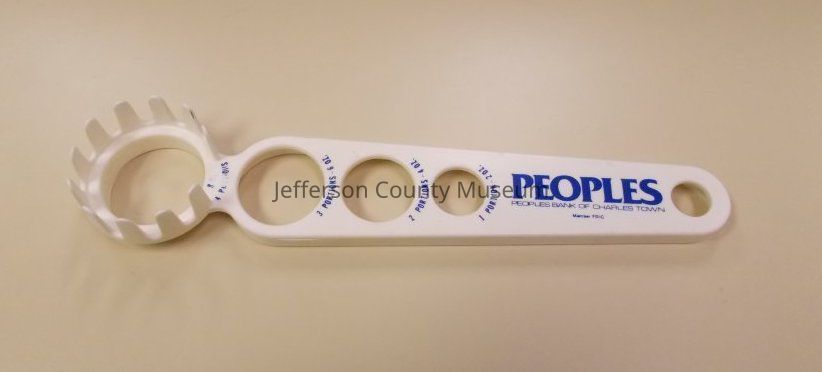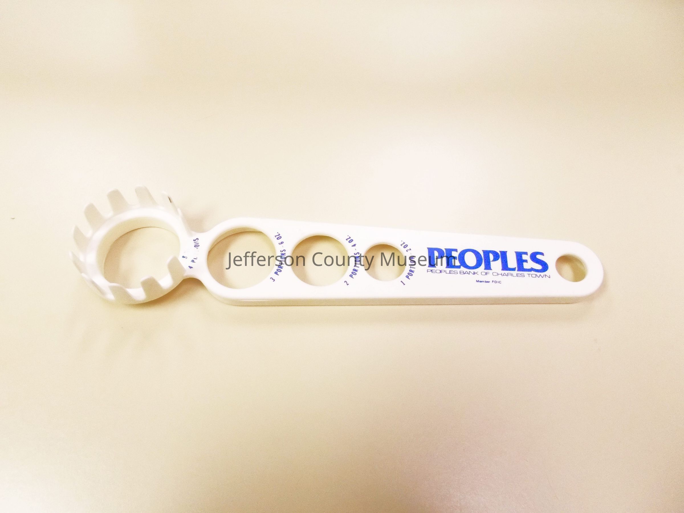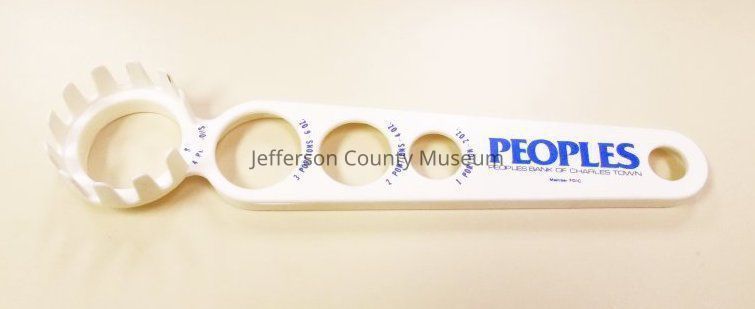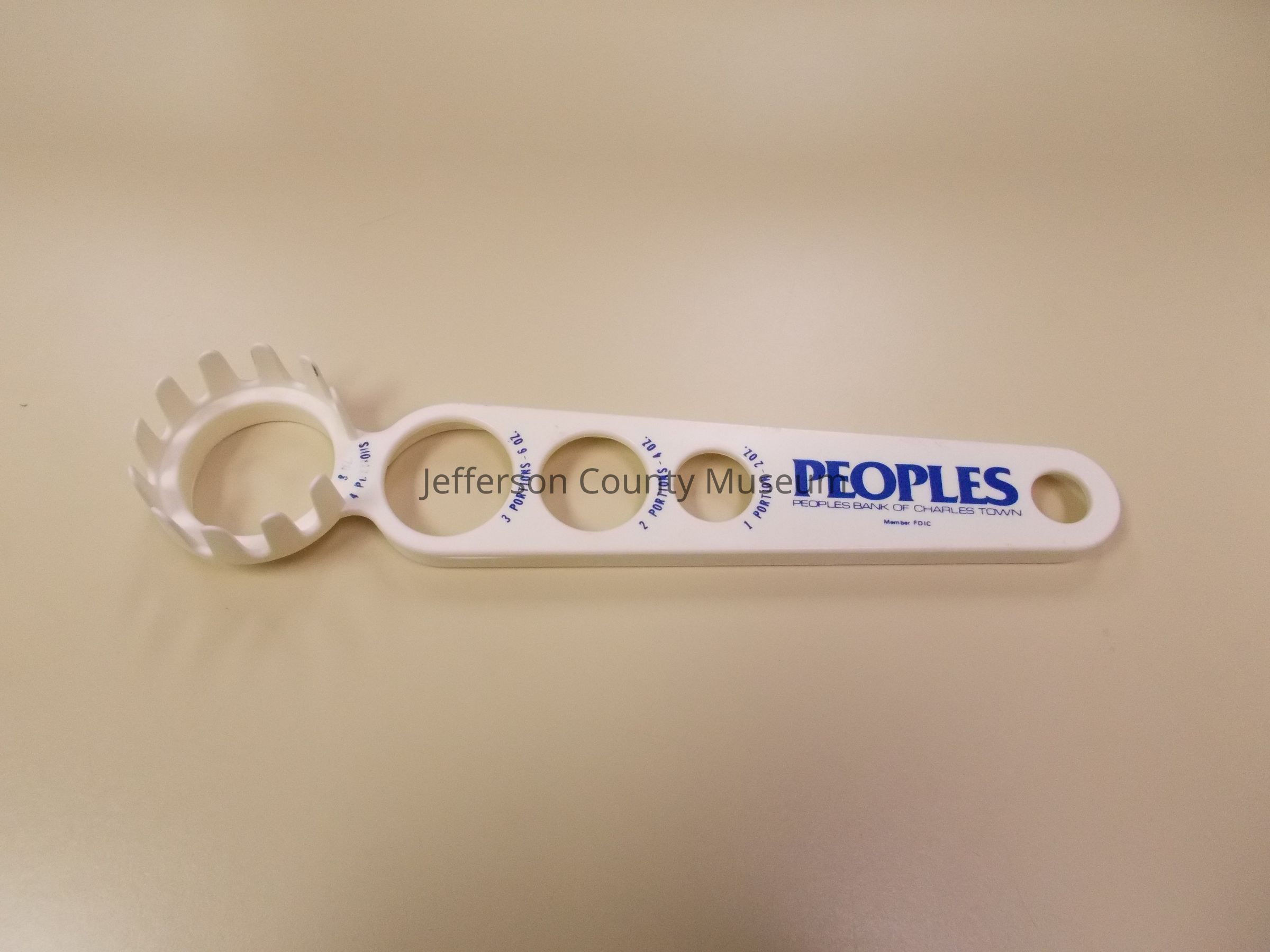 20th century white plastic spaghetti spoon advertising Peoples Bank of Charles Town in blue text that reads "PEOPLES" in large font, and below in smaller font: PEOPLES BANK OF CHARLES TOWN Member FDIC. Different sized holes along the handle allow for the user to measure servings of dry spaghetti noodles before cooking, reading: 8OZ - 4 PORTIONS, 3 PORTIONS - 6OZ, 2 PORTIONS - 4OZ, and 1 PORTION - 2OZ. Prongs around end of spoon allow for grasping cooked noodles.Acquisition