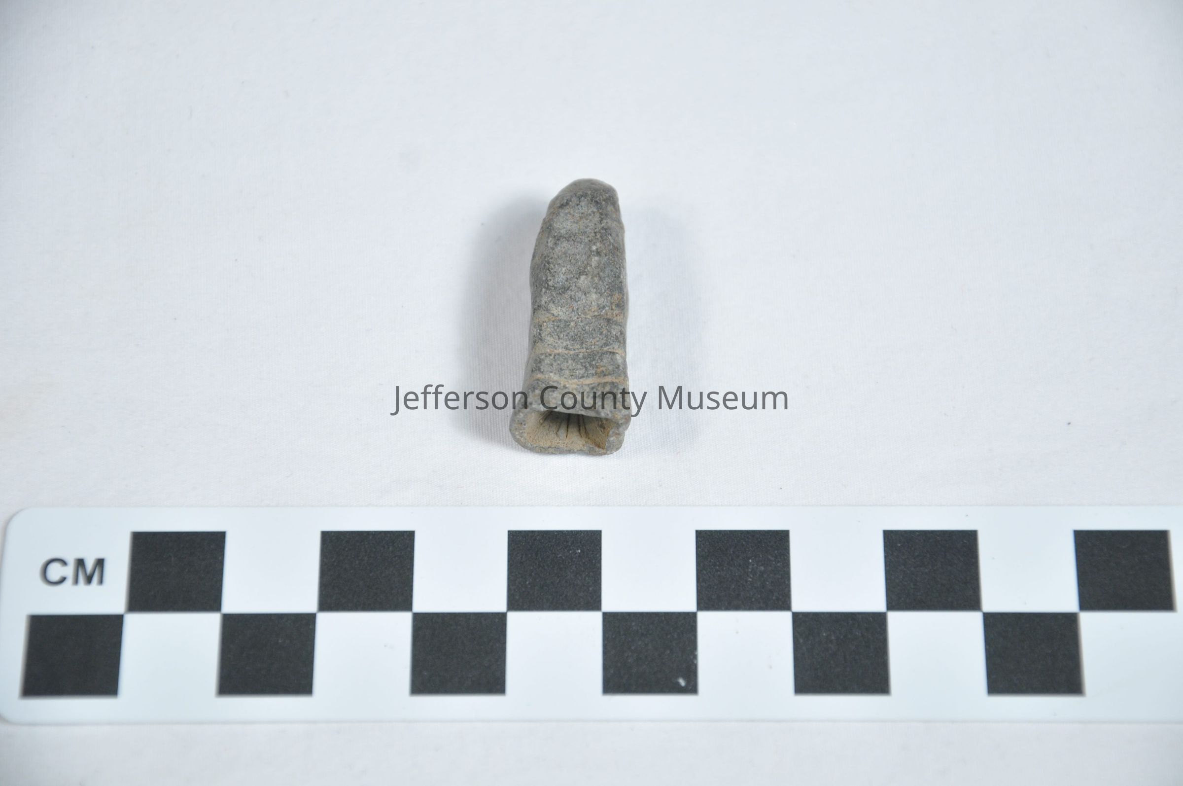 Lead bullet made into a sinker from the Potomac River at Harpers Ferry. Small hole at tapered end of bullet for attaching fishing line. There are three grooves around the other end of the bullet.Acquisition