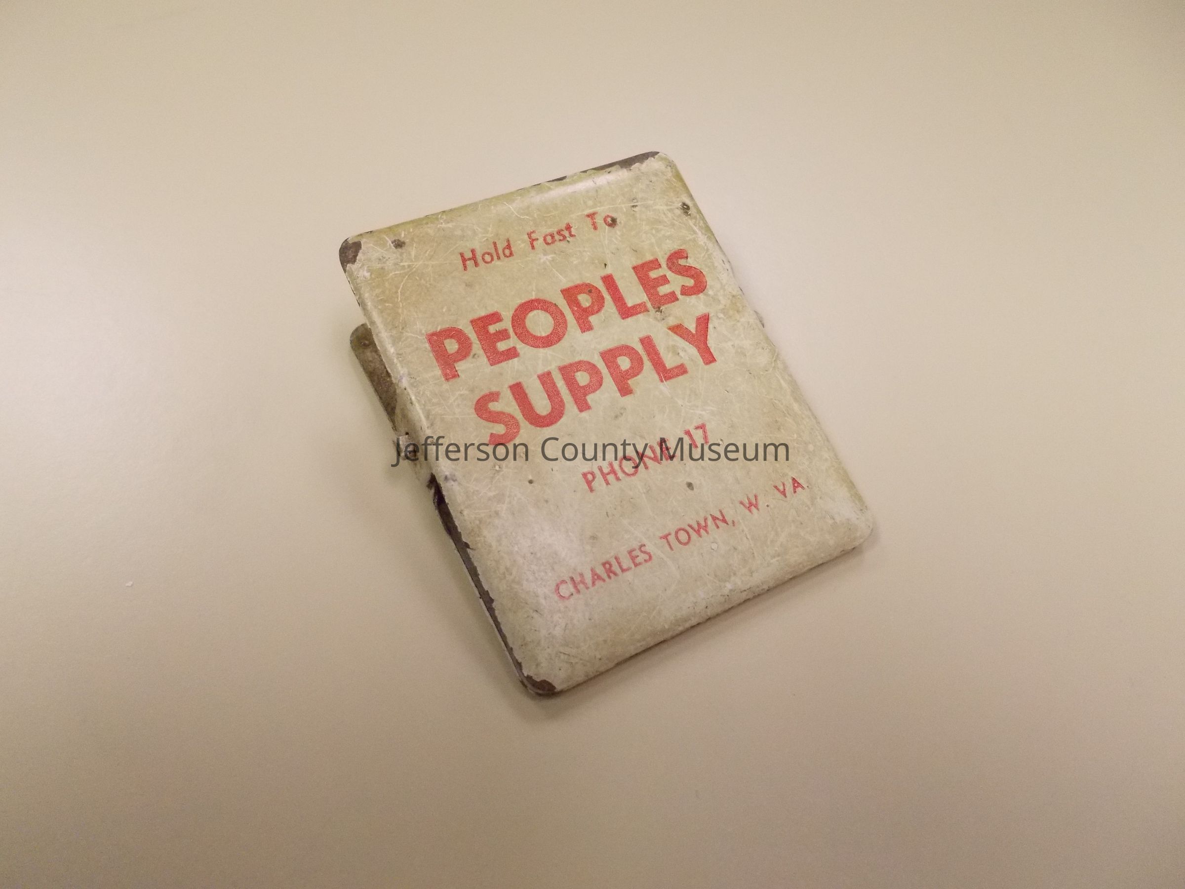 20th century metal clamp or clip advertising Peoples Supply in Charles Town, W.Va. Clamp is spring loaded and painted white with orange text.Acquisition