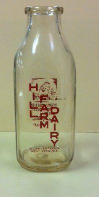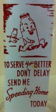 20th century clear glass milk bottle with red text from Hill Farm Dairy. Red text on bottle reads on one side: HILL FARM DAIRY. On the other side, there is a cartoon image of a milk bottle smiling, with arms and legs, appears to be running. Text below the image reads: "To serve you better don't delay, Send me speeding home today."Acquisition