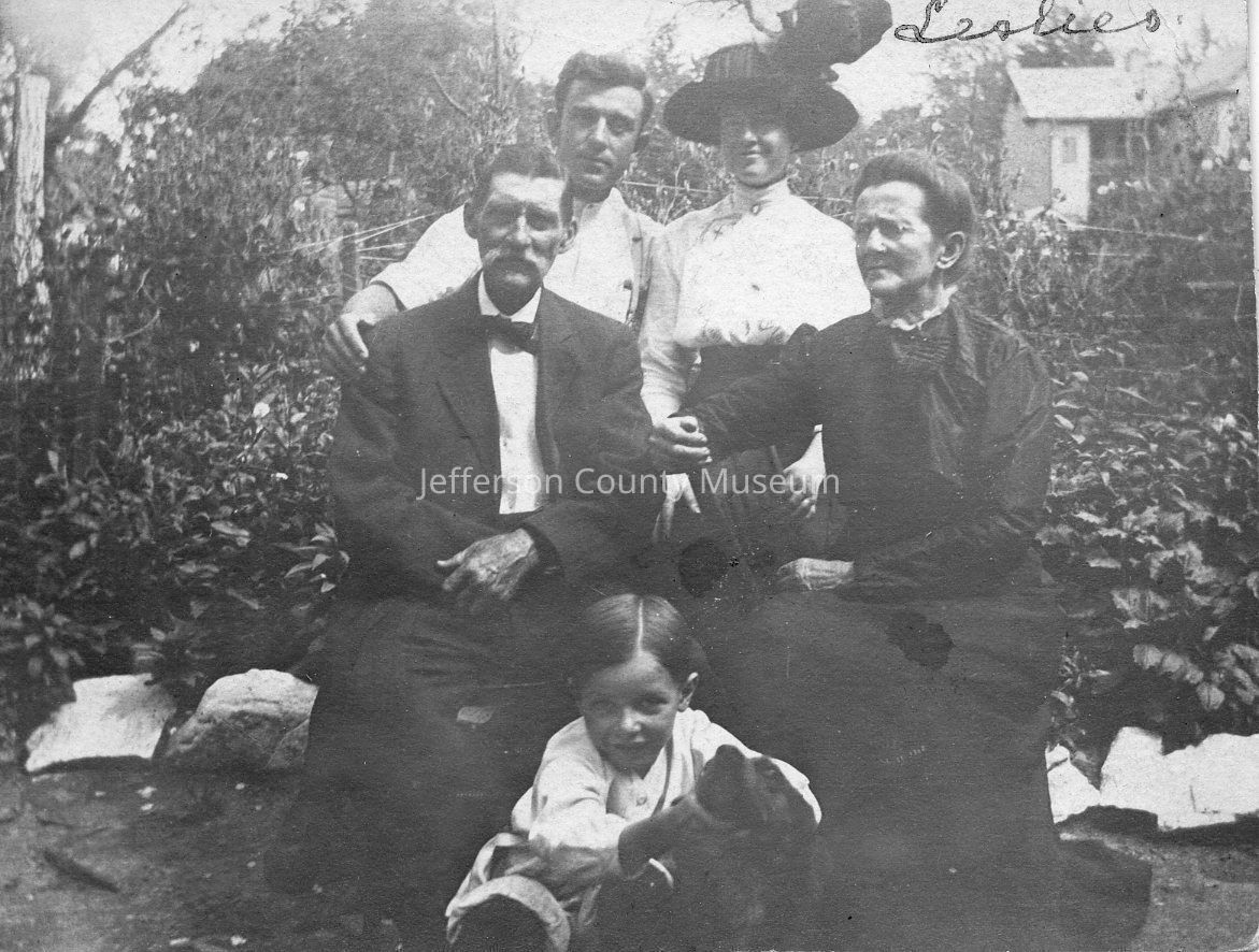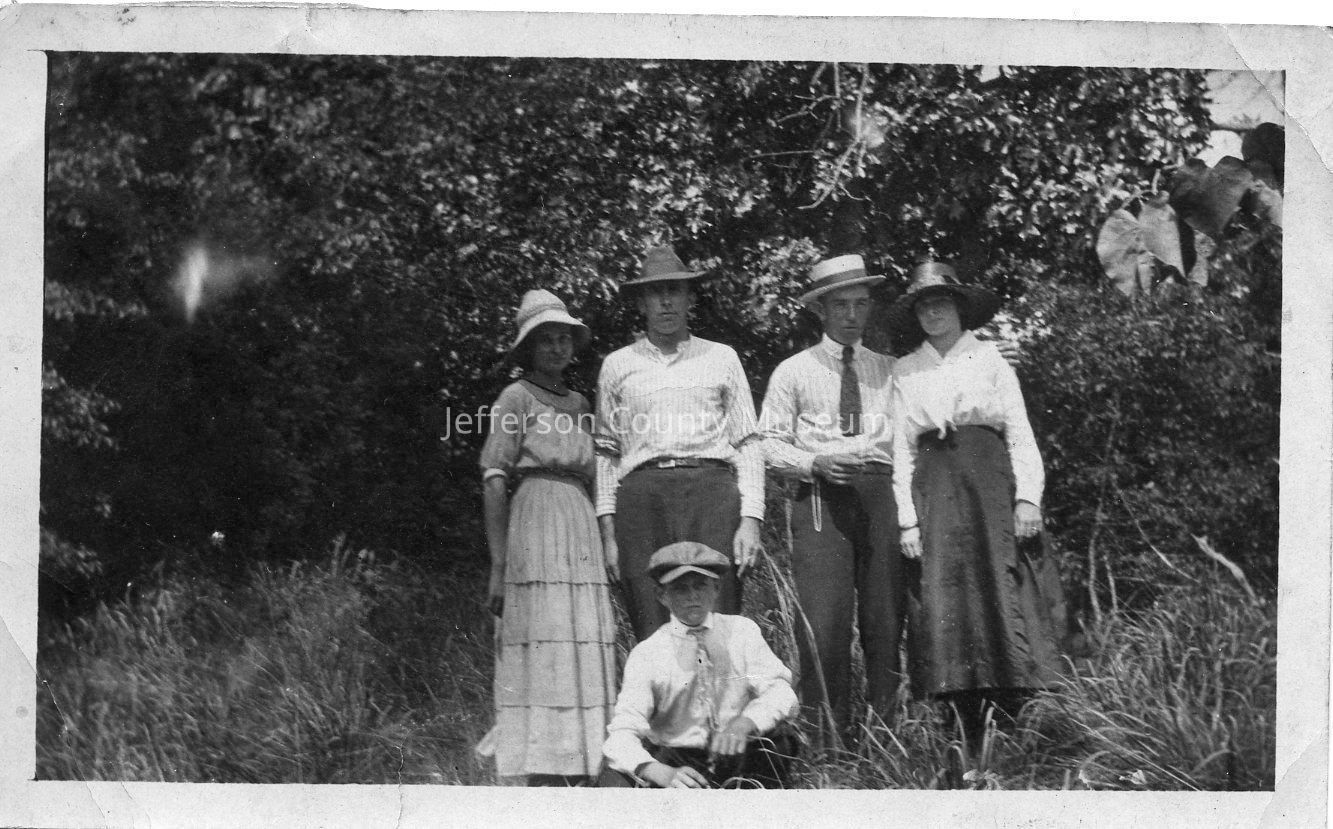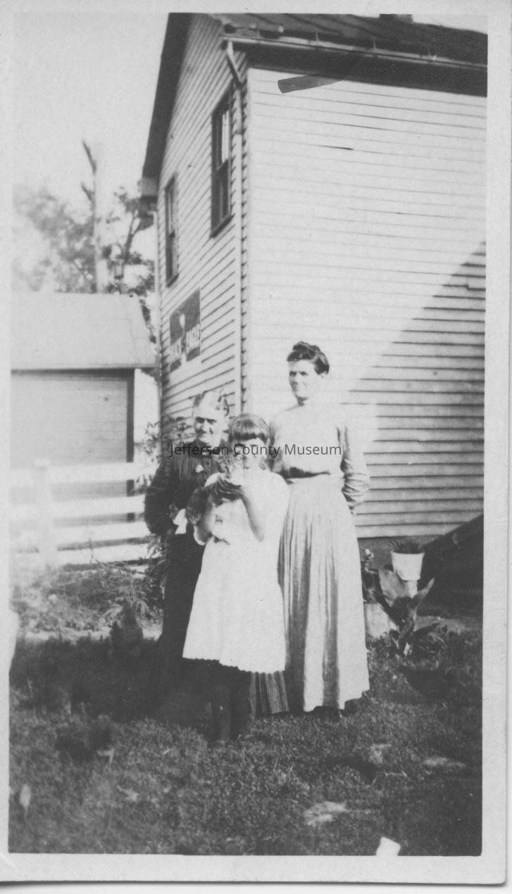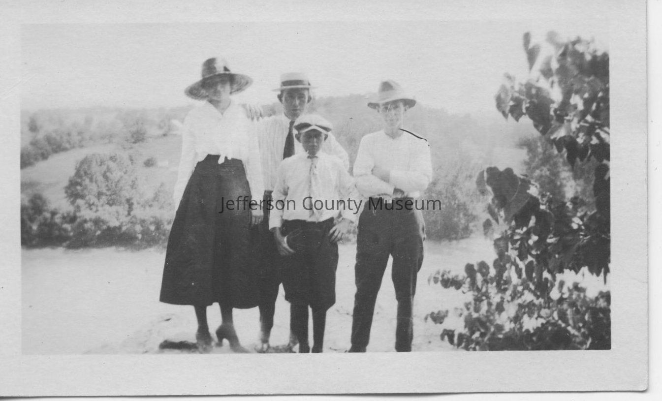 photo of Mr. & Mrs. Leslie, Clara Leslie (wearing hat), a Hill cousin next to Clara, and Erroll Leslie in front