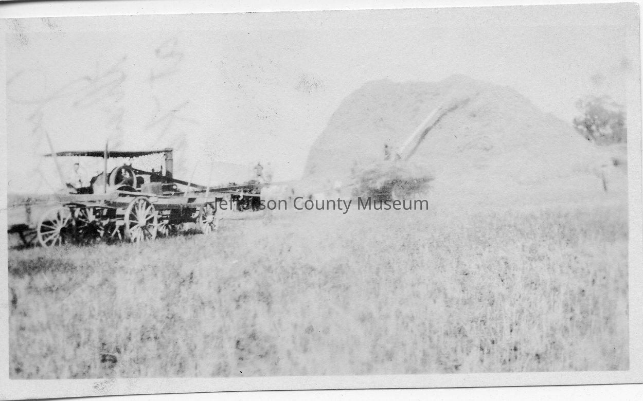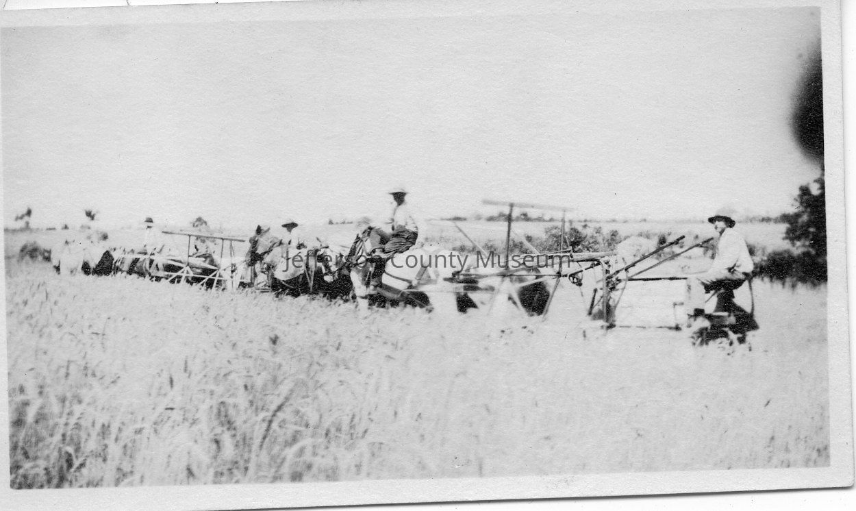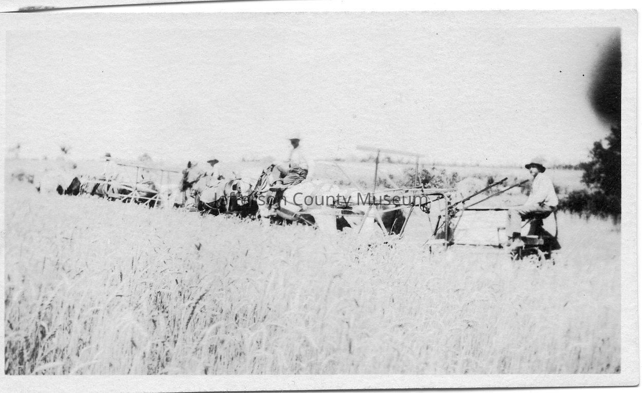 3 photos harvesting wheat on "Kanode" farm near Rippon in 1918 or 1919 (handwriting on back of photos is that of C.D.G.M. and she probably was photographer)