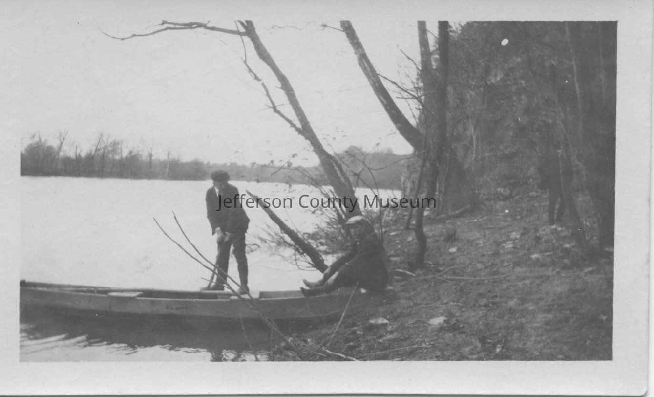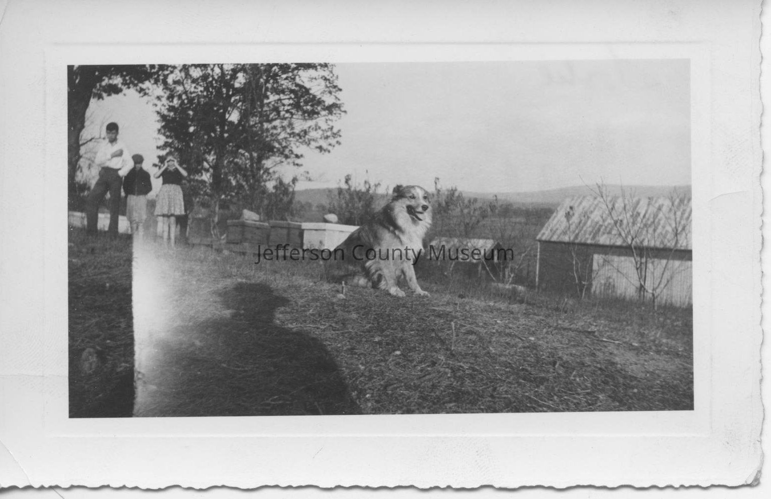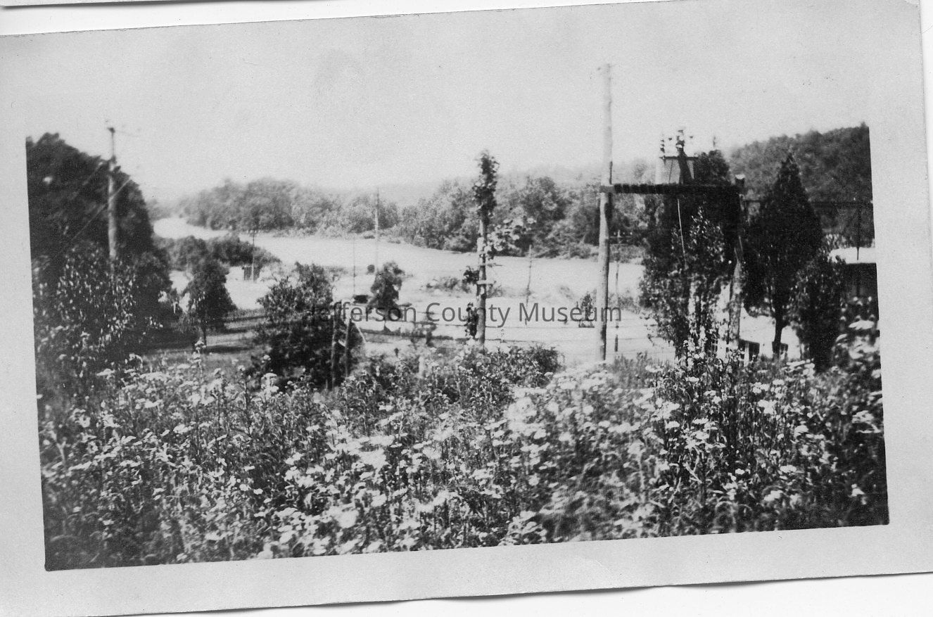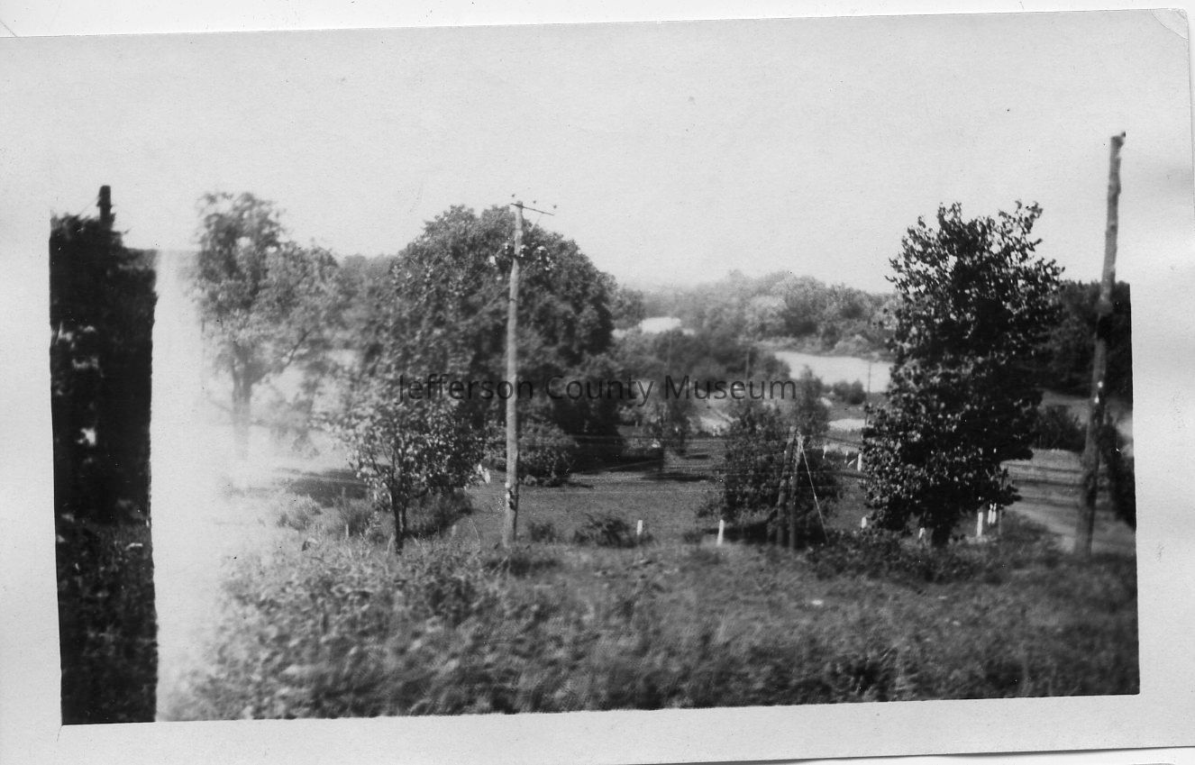 photo of "Gore" yard (?), on road to Millville and river, 1920 (photographer probably C.D.G.M., handwriting on back is that of C.D.G.M.)
