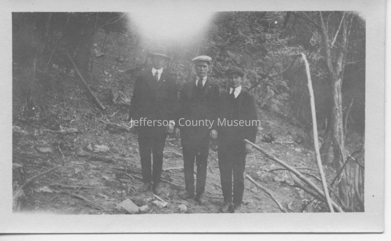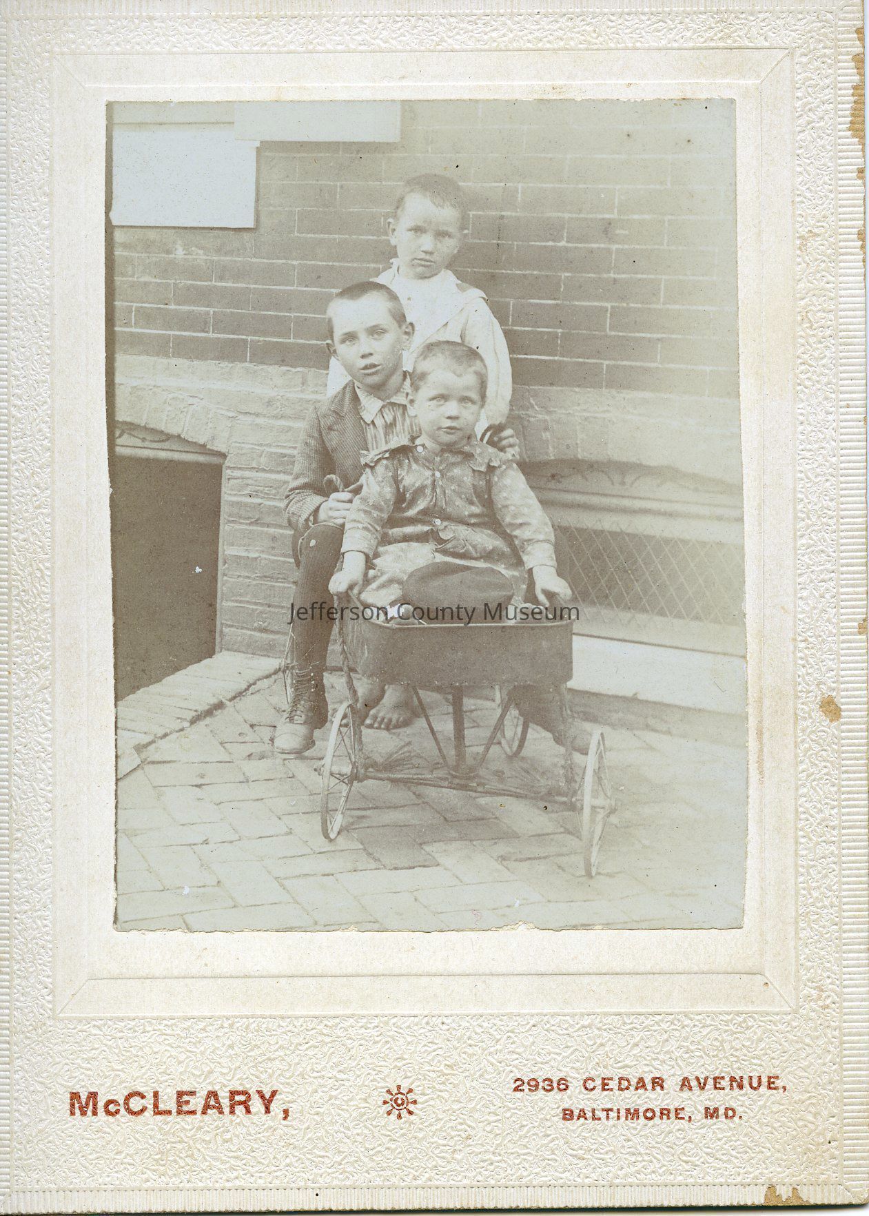 cabinet photo of three boys and a wagon or buggy, cardboard backing, McCleary Studio in Baltimore, MD, identified on reverse as Lawrence, Guy, and ____ Orr