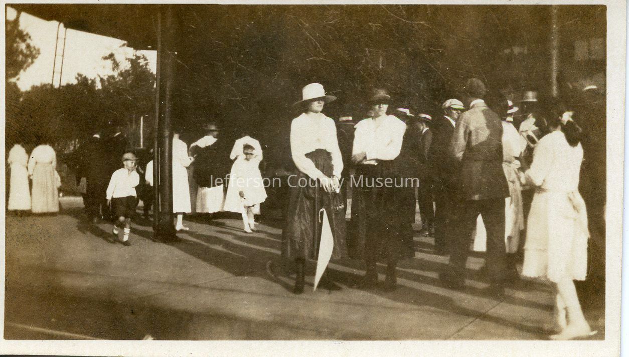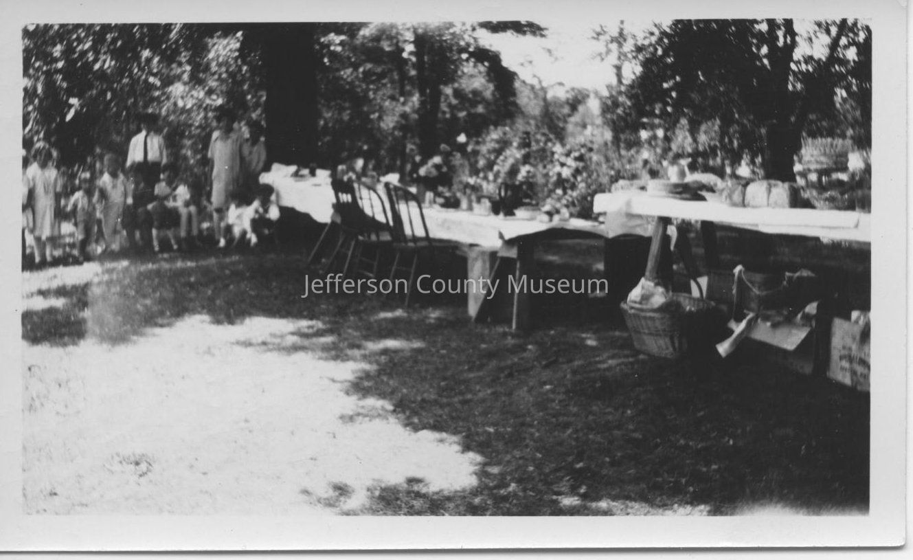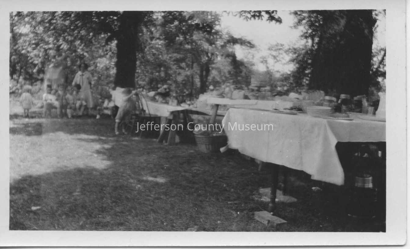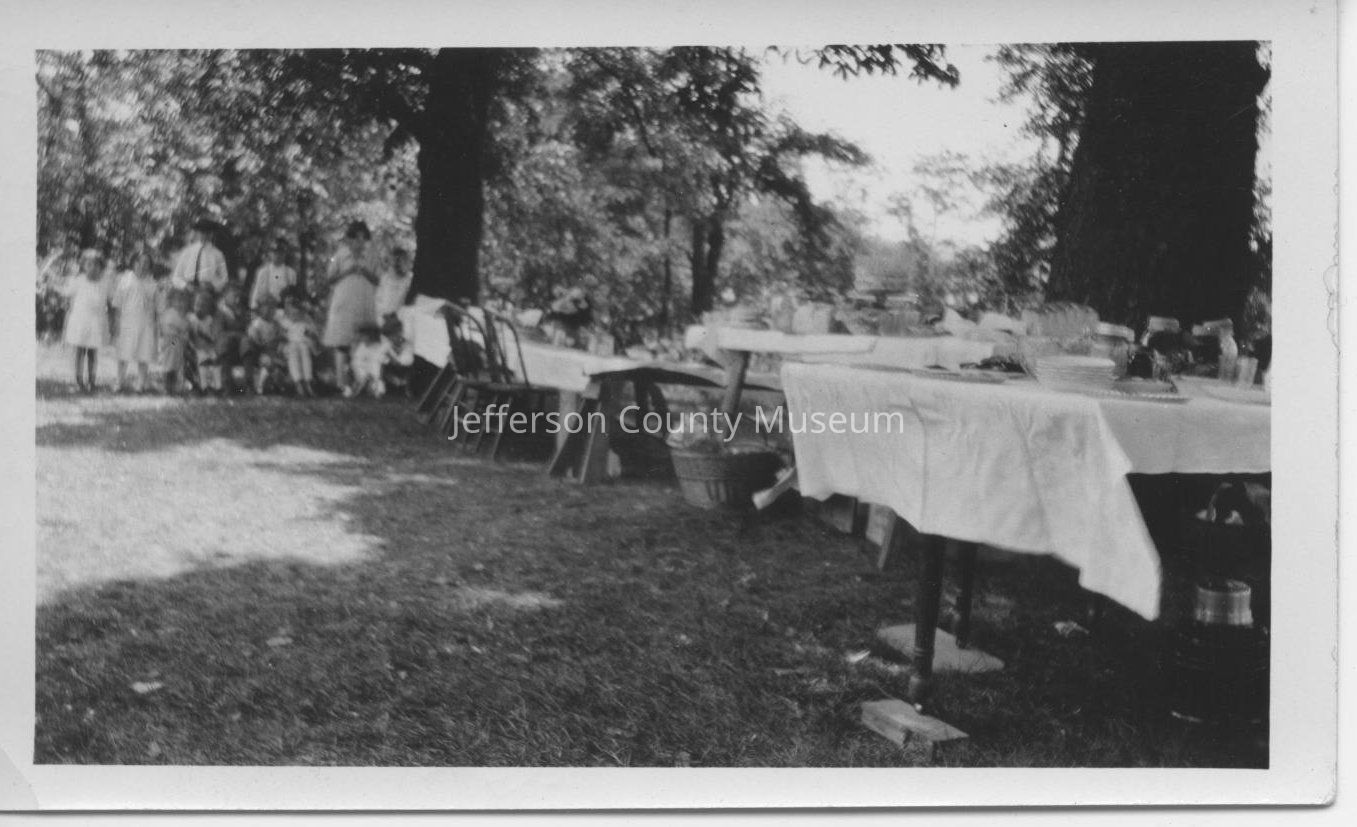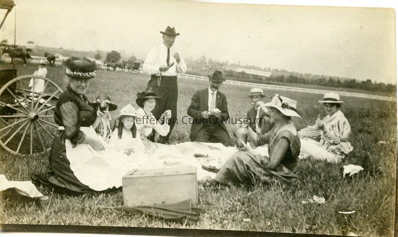 photo identified on reverse as "Dinnetime at the horse show", and includes James & wife, Clara (Leslie), Mr. Oyerly, Mr. & Mrs. Grubbs, Lillian, and Katie (Leslie)
