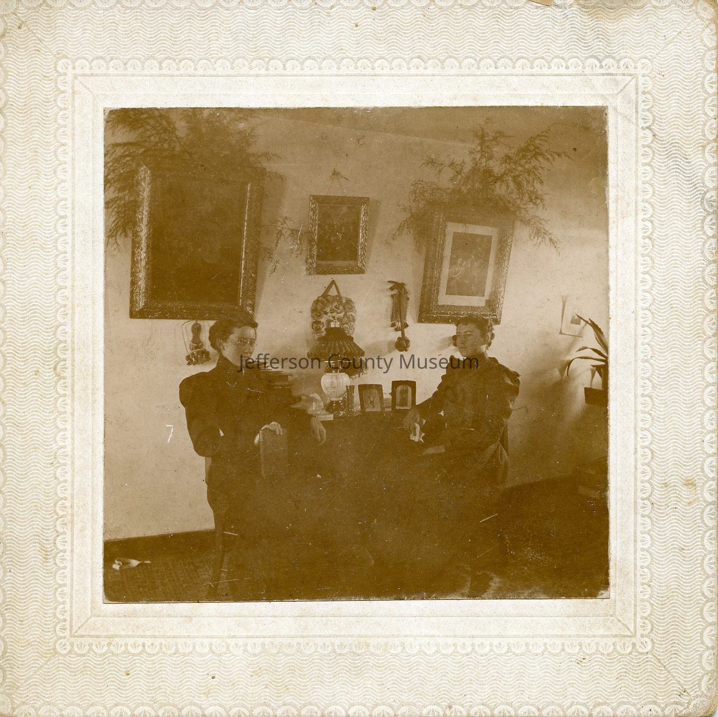 photo on cardboard backing of two women seated at a table, handwritten on reverse "To Aunt Jennie from Florene and Clara" (Florene and Clara Leslie)