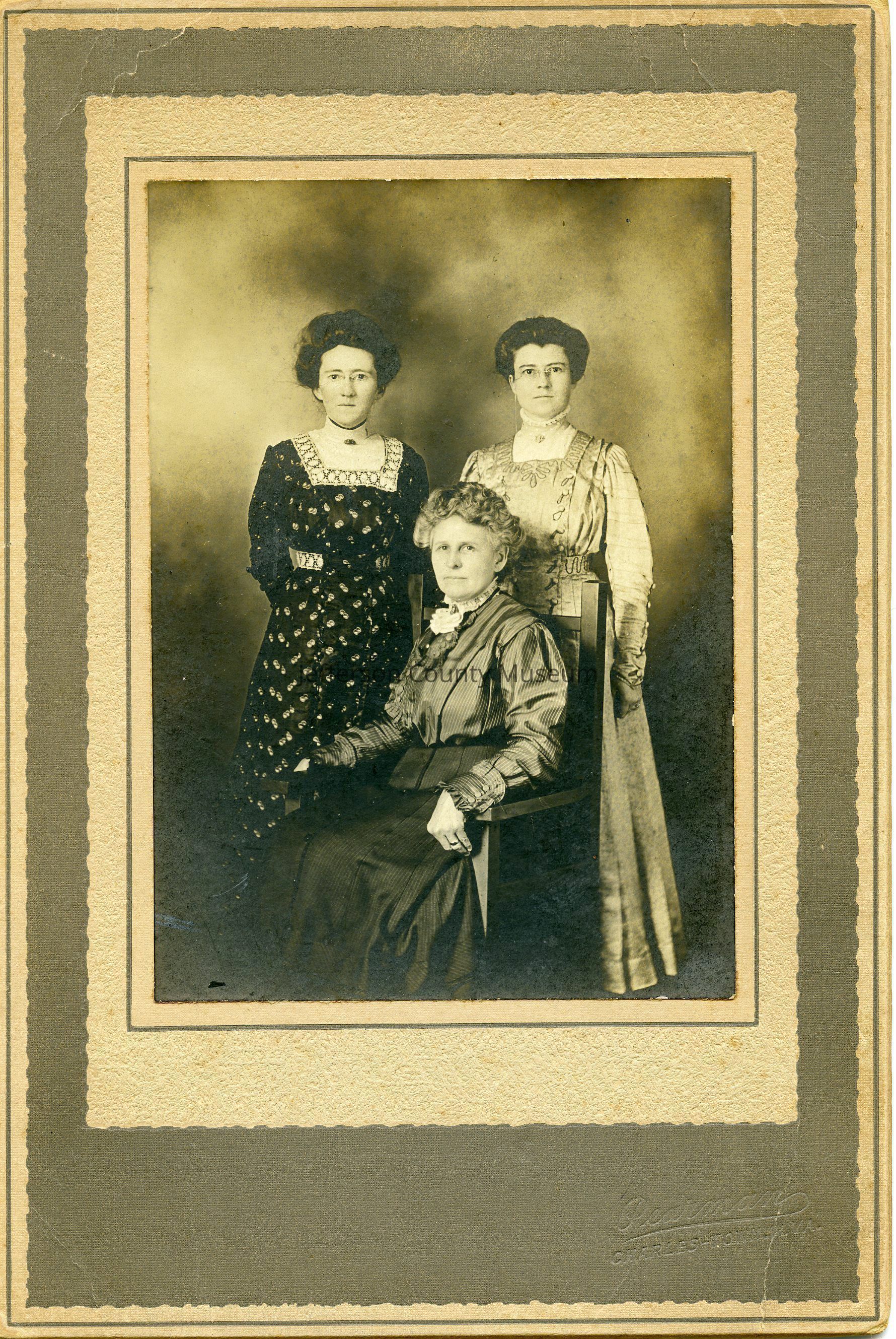 photo on cardboard backing of three women, one is seated with two women standing behind her, handwriting on reverse indicates that the two women standing may be Clara and Florene Leslie, photo taken by studio in Charles Town