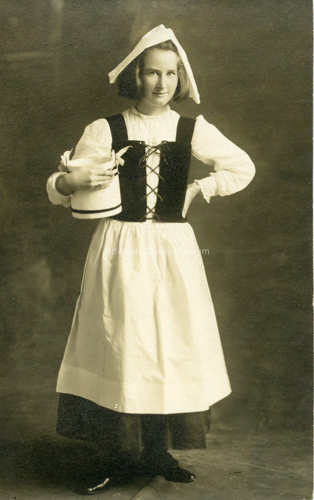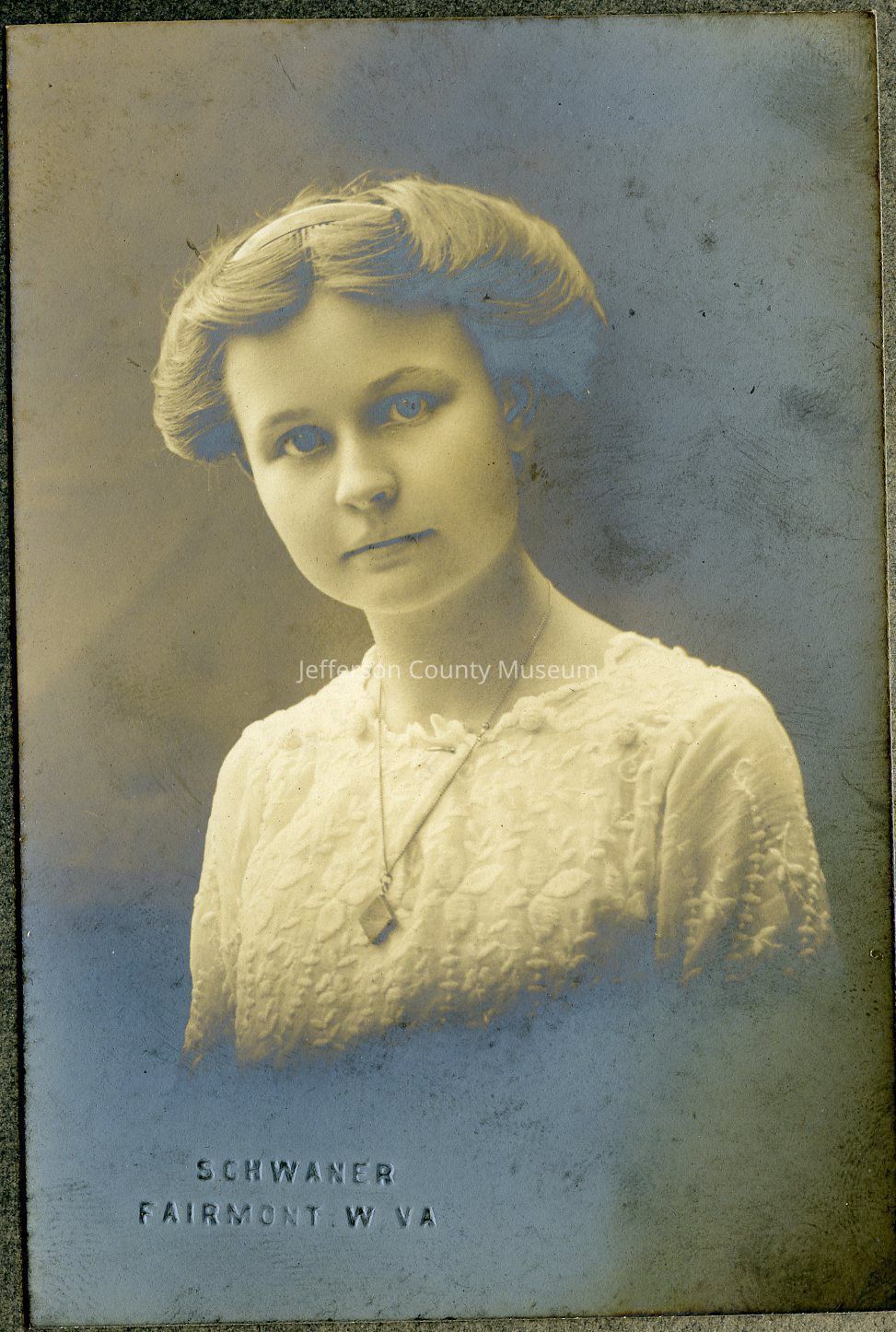 photograph of Carlotta Dice Gruber as young girl, no date, but approximate age of 13-15; photo taken by Schwaner Studio in Fairmont, WV; photo pasted to cardboard frame