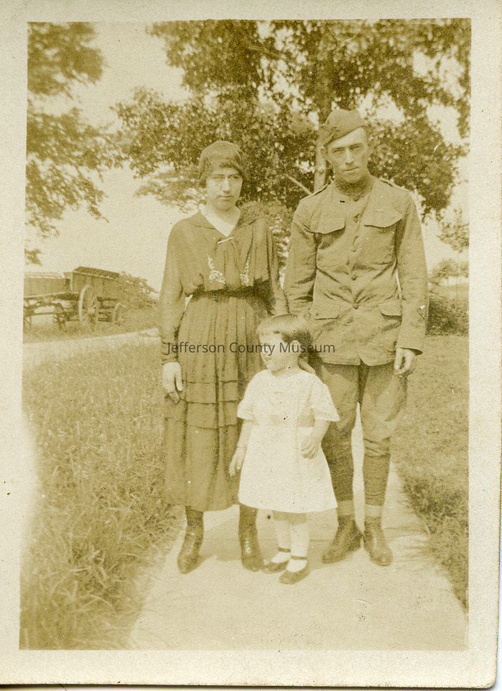 small photograph of unidentified World War 1 soldier, woman, and small child