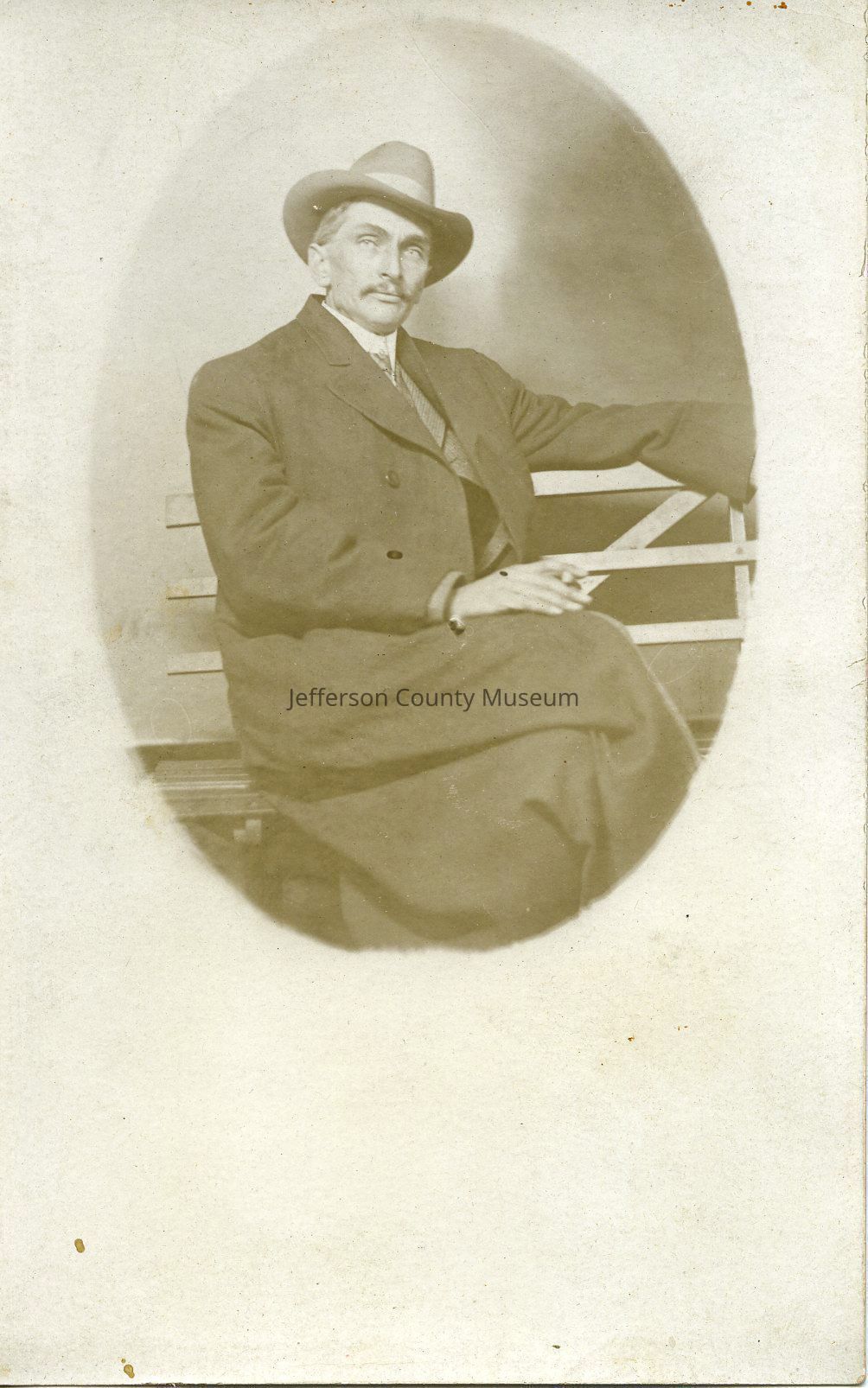postcard-style photo of unidentified man, seated on park bench, wearing overcoat and fedora - may be early photo of John J. Gardner