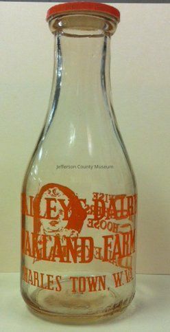 20th century clear glass milk bottle with orange text from Dailey's Dairy Oakland Farm, located on Route 9. On one side of the bottle, text reads: DAILEY'S DAIRY OAKLAND FARM CHARLES TOWN, W.VA. On the other side, there is an image of a baby's face with text that reads: WISE MOTHERS CHOOSE DAILEY'S DAIRY. A paper lid is rested on the bottle's opening.Acquisition