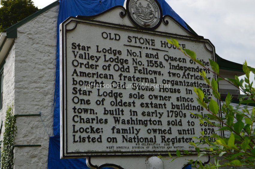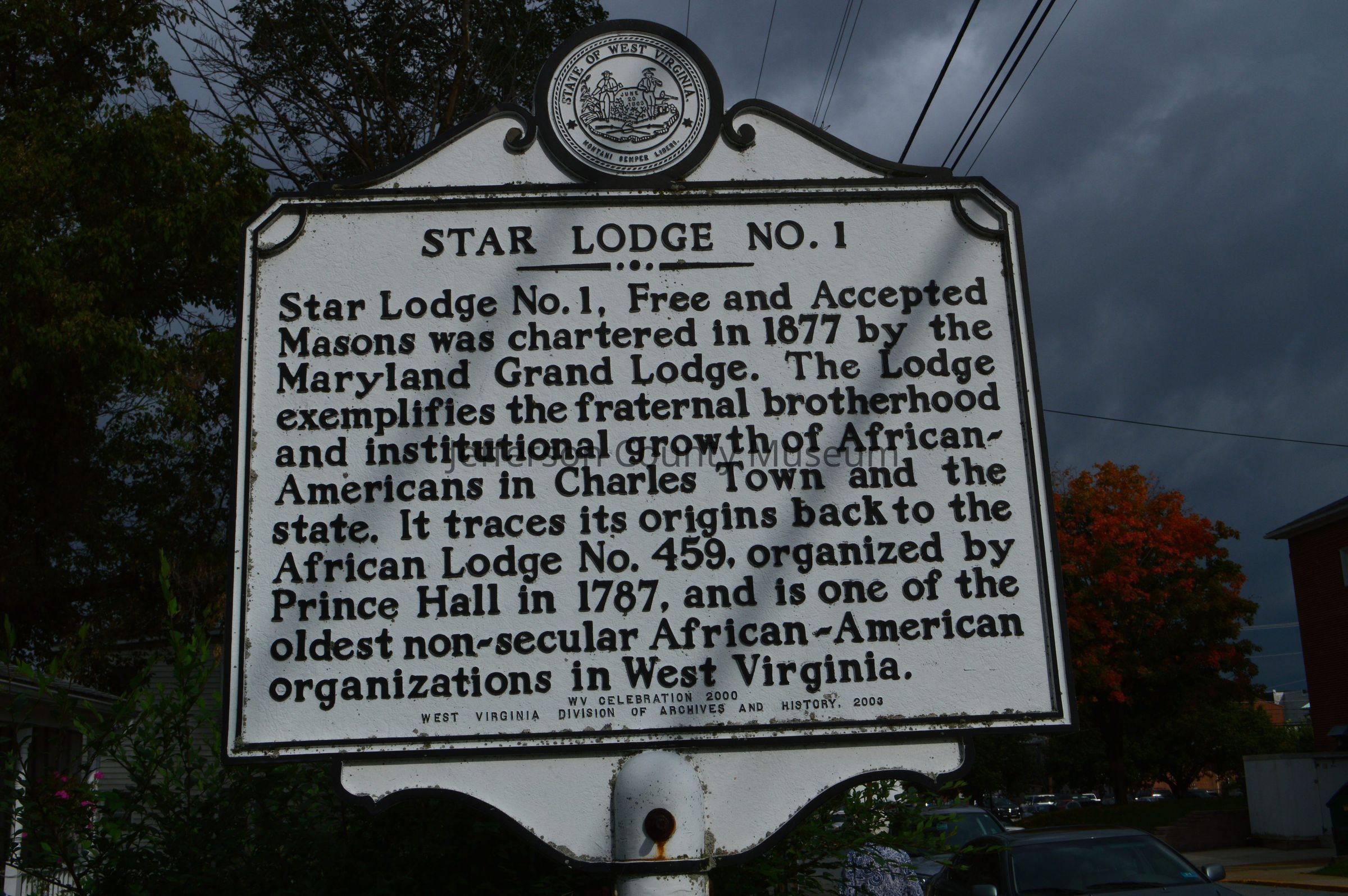 Historic marker reads: "Star Lodge No. 1, Free and Accepted Masons was chartered in 1877 by the Maryland Grand Lodge. The Lodge exemplifies the fraternal brotherhood and institutional growth of African Americans in Charles Town and the state. It traces its origins back to the African Lodge No. 459, organized by Prince Hall in 1787, and is one of the oldest non-secular African-American organizations in West Virginia."