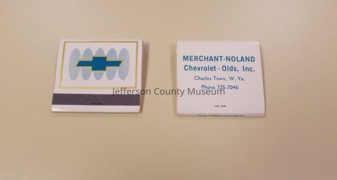 20th century matchbook advertising Merchant-Nolan Chevrolet car sales. Front of matchbook has the Chevrolet logo in blue and gold; back of matchbook reads: MERCHANT-NOLAND Chevrolet - Olds, Inc. Charles Town, W.Va. Phone 725-7045. Inside matchbook cover reads: On the move. The Chevrolet '70s. Text along top edge of matchbook reads: On the move. Text along bottom edge reads: LION MATCH CORP. OF AMERICA - DETROIT.Acquisition