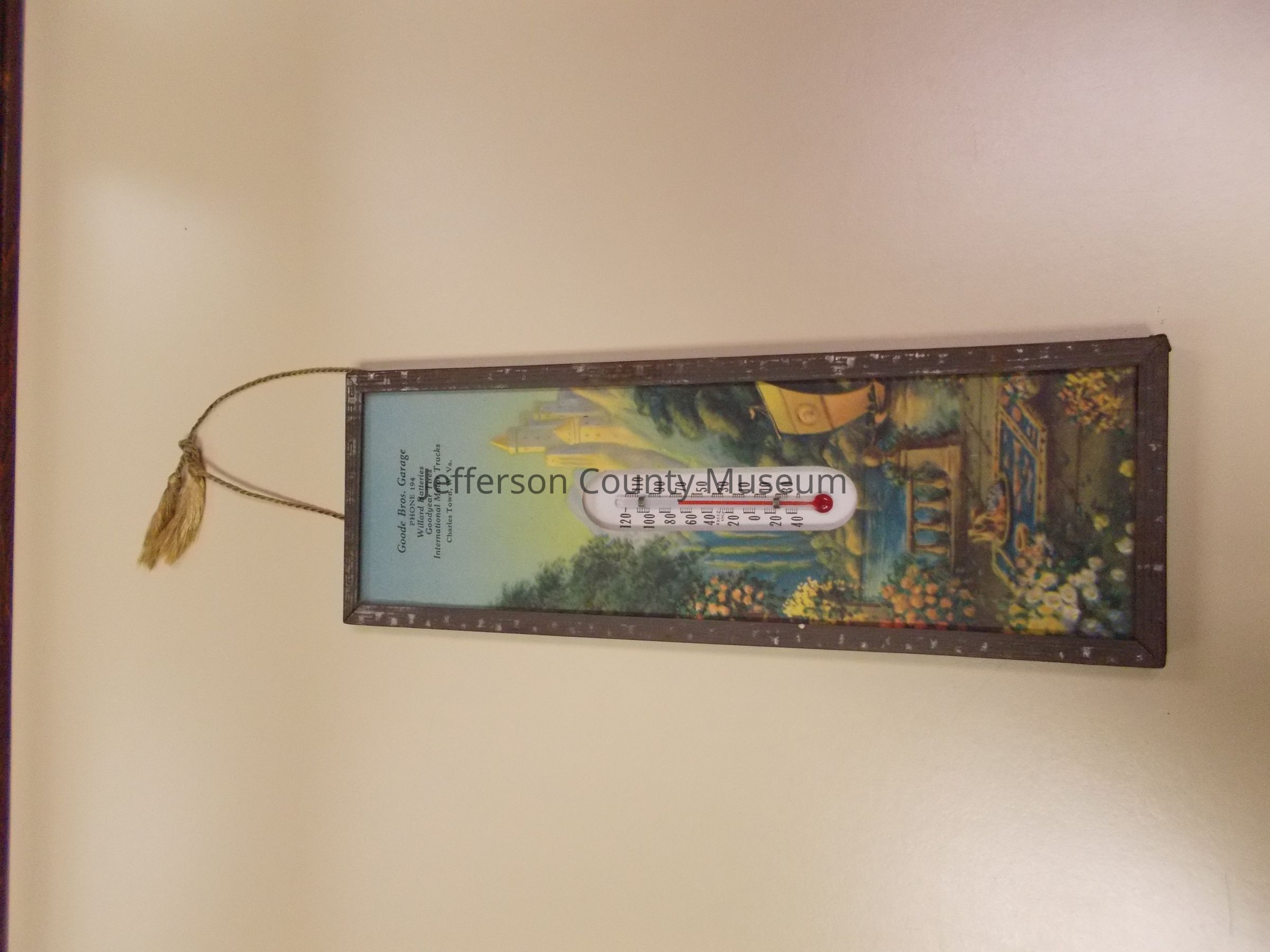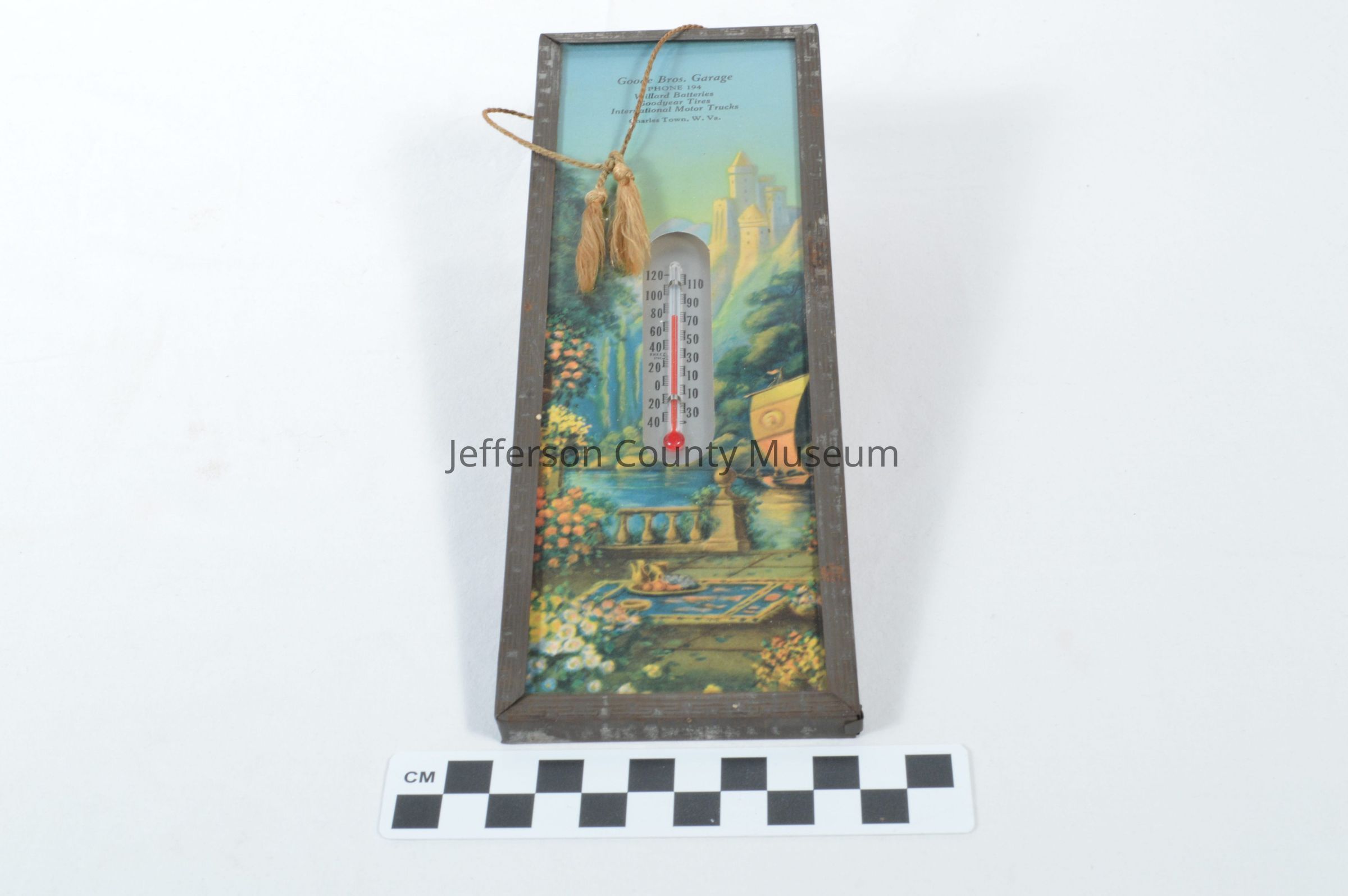 20th century garage wall thermometer advertising Goode Bro. Garage, a Charles Town business. Thermometer is mounted to a small painted image of a body of water with a ship, a terrace in the foreground, and castle in the background. Image and thermometer are mounted in a metal frame with a string at the top for hanging. Text at the top of the image reads: Good Bros. Garage PHONE 194 Willard Batteries Goodyear Tires International Motor Trucks Charles Town, W.Va.Acquisition