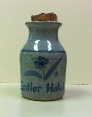 Gray, stoneware spice jar made by Sycamore Pottery for the Historic Shepherdstown Commission's fundraising efforts for the restoration of the Entler Hotel. Jar is numbered: 137 out of 500. Jar has large cork stopper and handpainted blue floral design above text: Entler Hotel. Jars were sold for $12.50.Acquisition