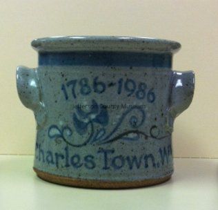 Gray, stoneware, two-handled crock made by Sycamore Pottery for the Charles Town Bicentennial Commission's fundraising efforts for the town's June 1986 bicentennial festivities. Crock is numbered 8 out of 100; crocks sold for $45 each and were made upon demand, as they were purchased. The face of the crock has a handpainted floral design with text that reads: 1786-1986 Charles Town, W.Va.Acquisition