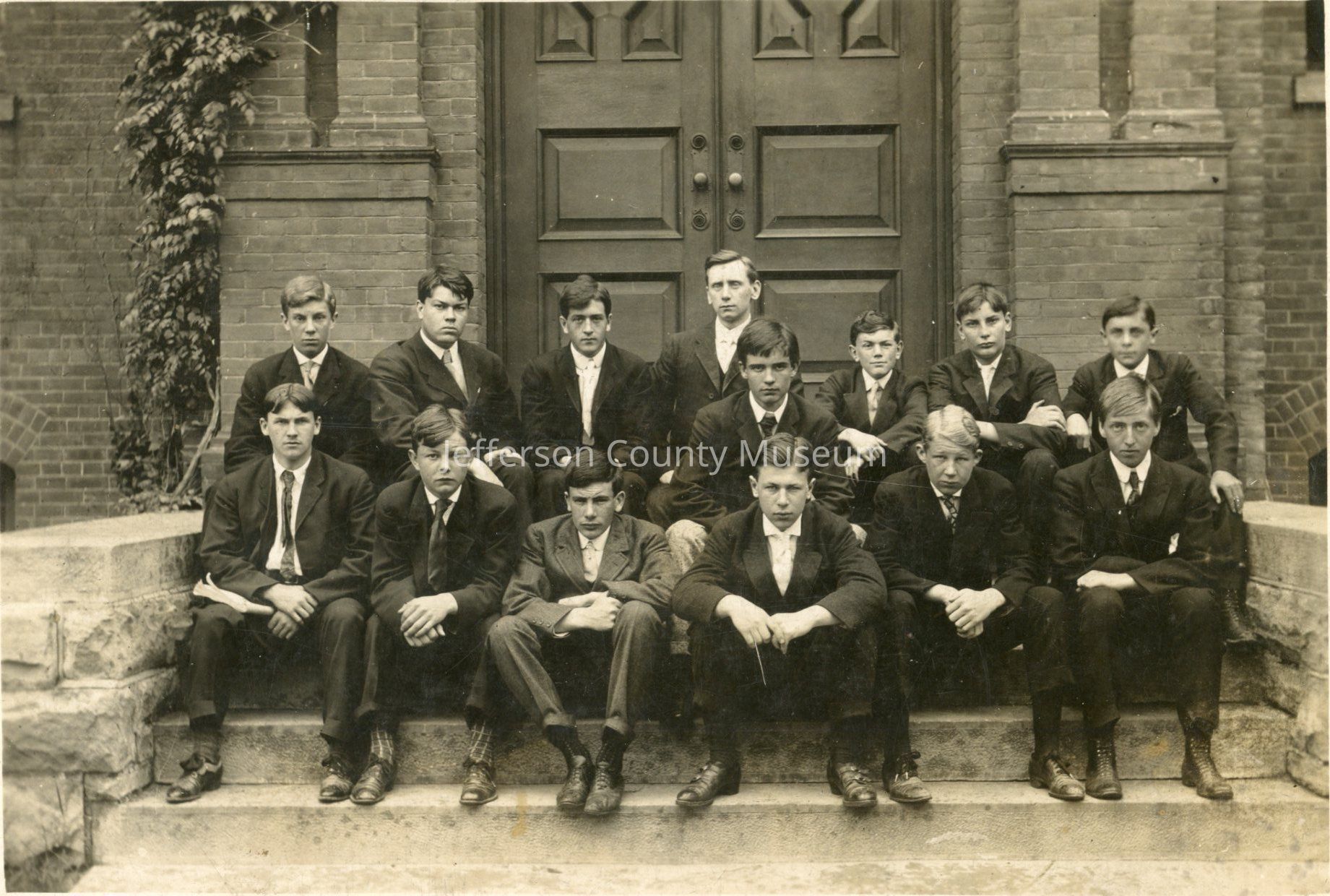 Portrait of fourteen men sitting on steps in front of a buildingAcquisition